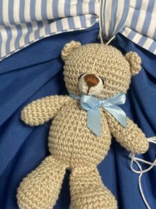 A completare la creazione, un tenero orsetto realizzato con la tecnica dell’amigurumi, simbolo di dolcezza e artigianalità.