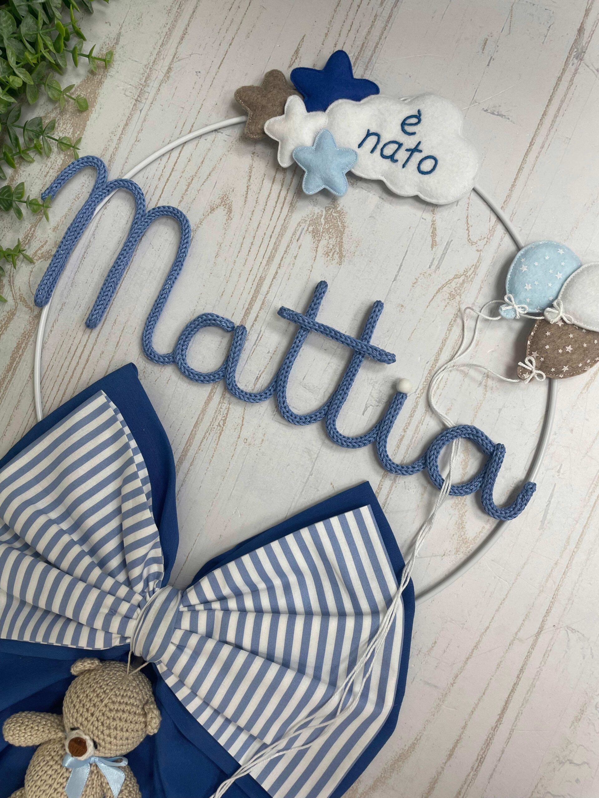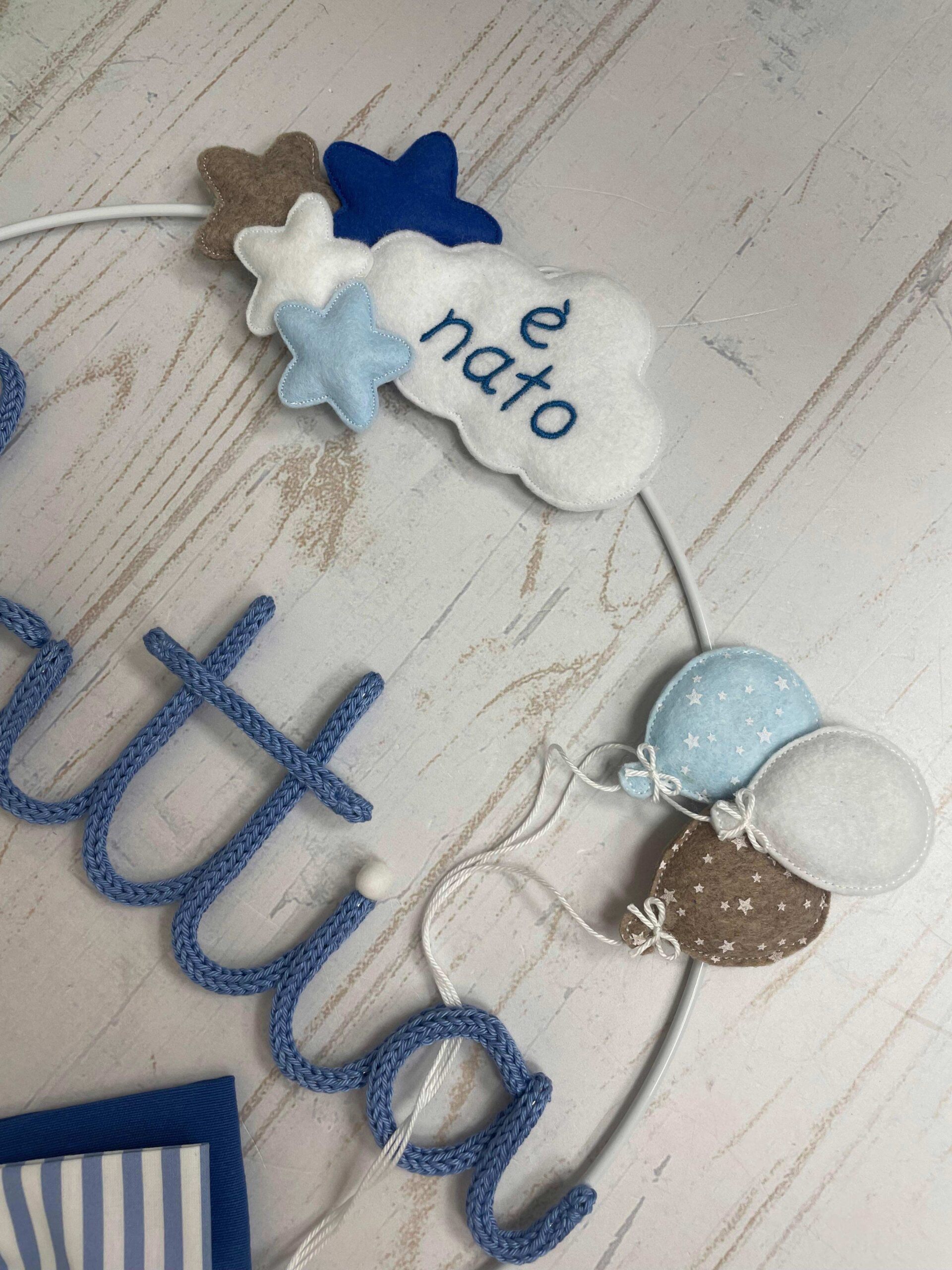 Un cerchio in metallo bianco decorato con stelline, palloncini e una dolce nuvoletta in pannolenci con la scritta “è nato” incornicia il nome del bimbo, realizzato in tricotin blu.