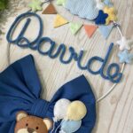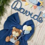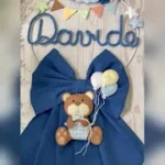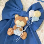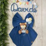 Il fiocco presenta un cerchio in metallo bianco decorato con elementi in pannolenci, al centro il nome del bimbo in tricotin azzurro e un tenero orsetto tridimensionale che tiene tra le zampe un filo con dei palloncini, per un effetto originale e delicato.