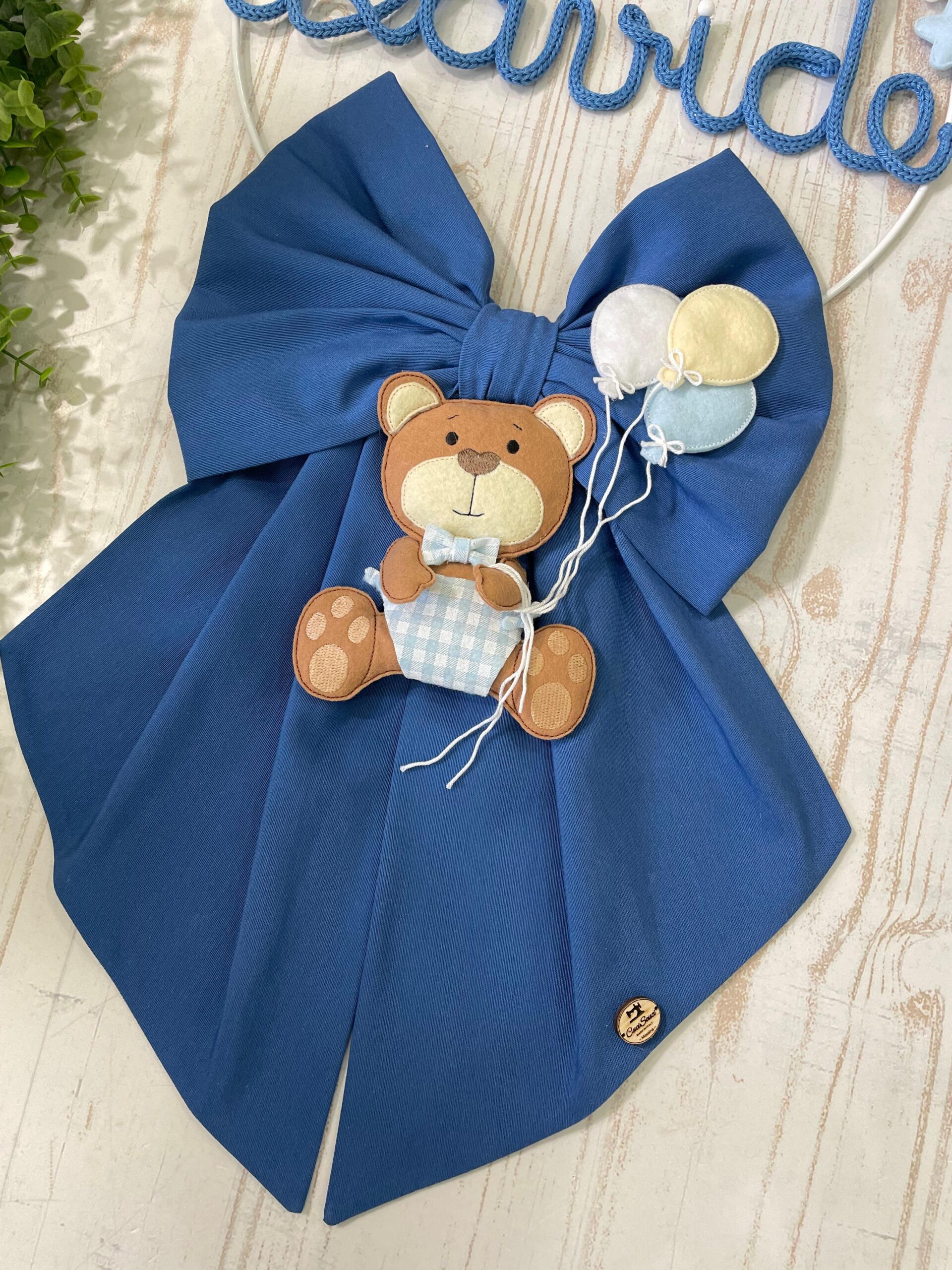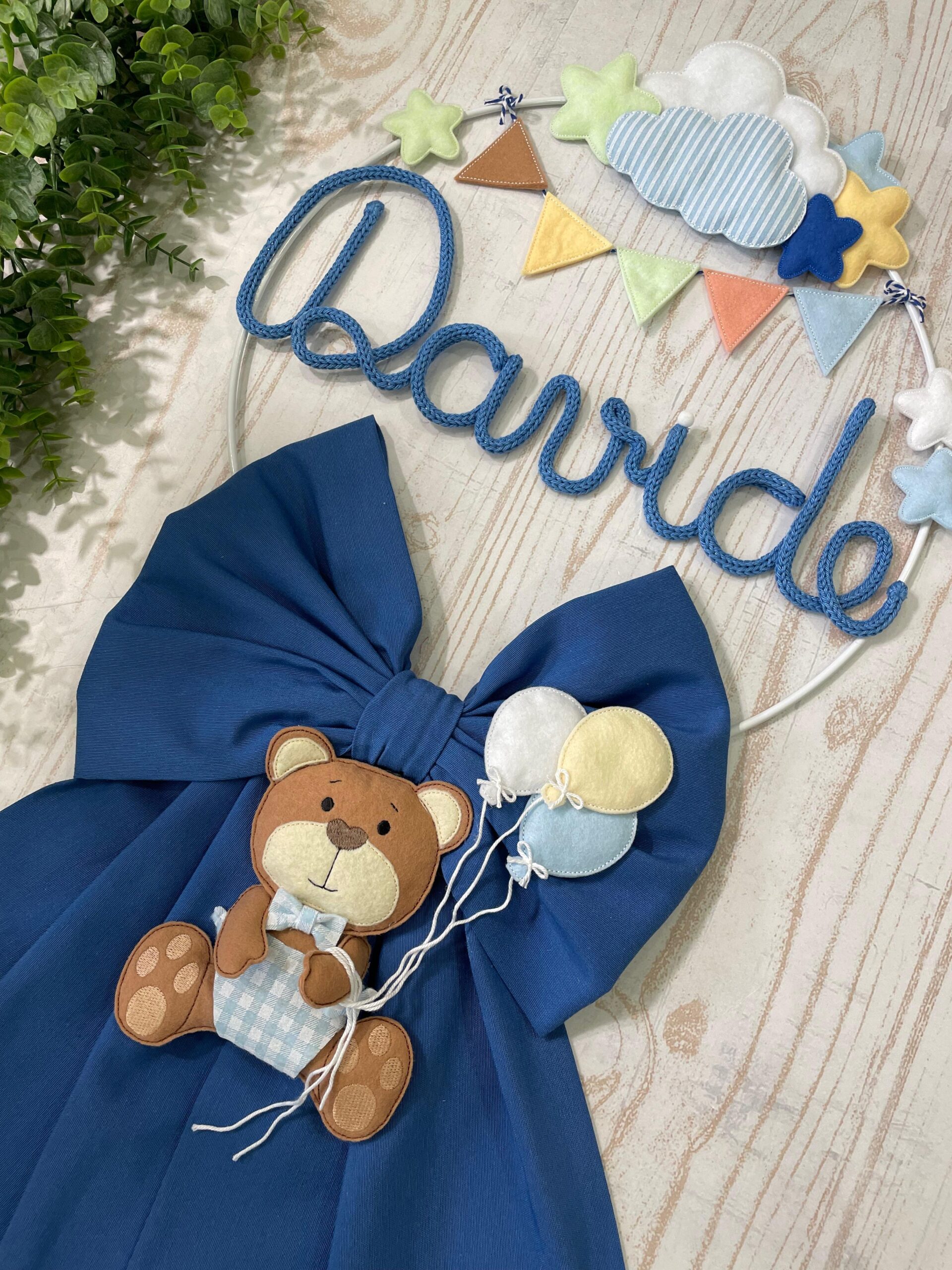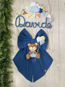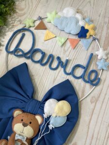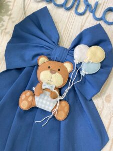 Il fiocco presenta un cerchio in metallo bianco decorato con elementi in pannolenci, al centro il nome del bimbo in tricotin azzurro e un tenero orsetto tridimensionale che tiene tra le zampe un filo con dei palloncini, per un effetto originale e delicato.