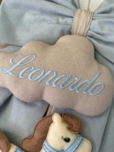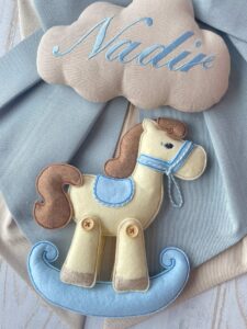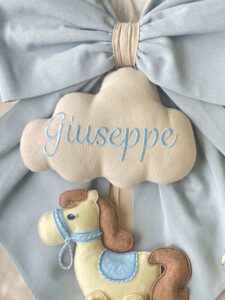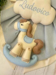 Sulla parte frontale è presente una nuvola in cotone con il nome del bimbo ricamato (personalizzabile), dalla quale pende un tenero cavalluccio a dondolo in pannolenci tridimensionale, simbolo di dolcezza e artigianalità.