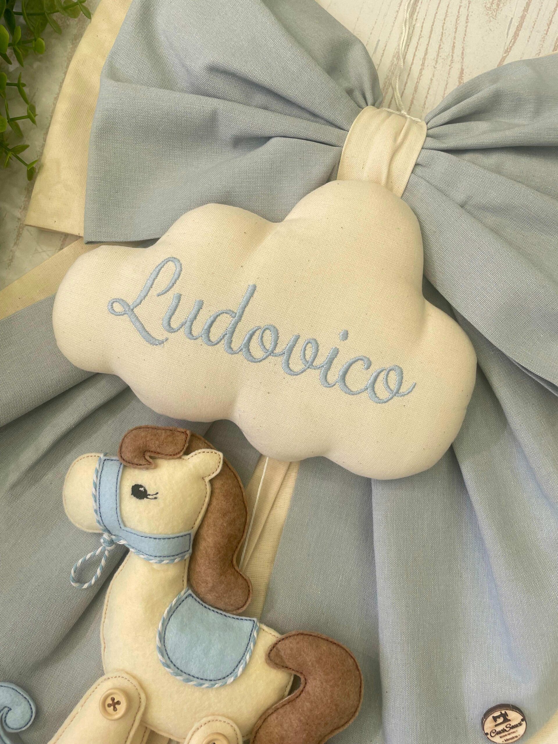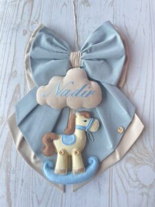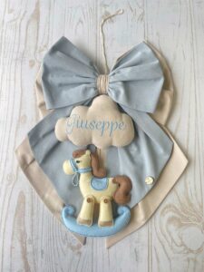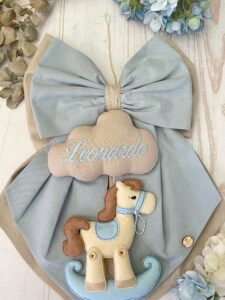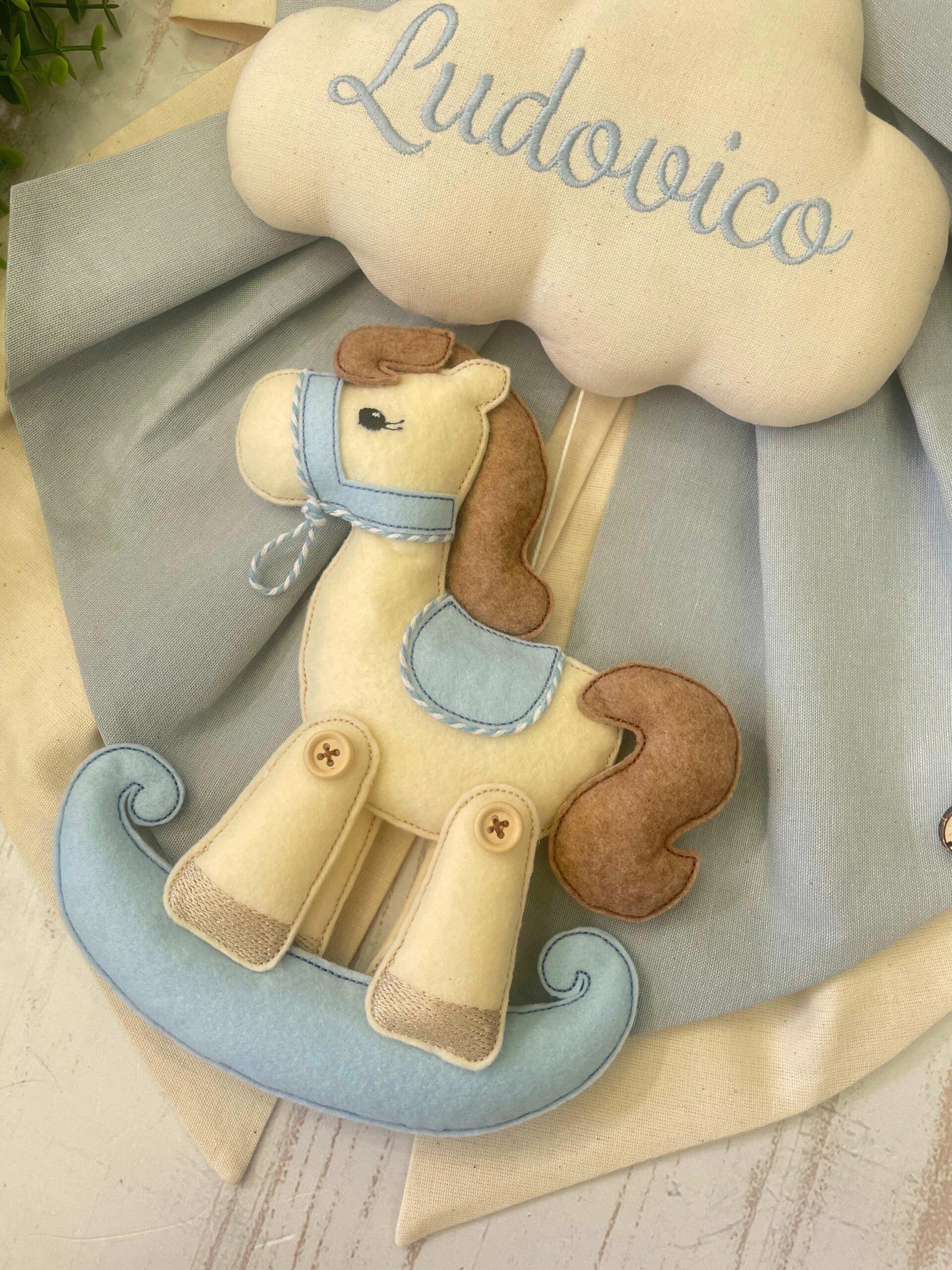 Fiocco Nascita Bimbo Nuvola e Mandorla con Ricamo e Cavallo a Dondolo