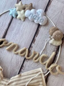 Un cerchio in metallo bianco decorato con stelline, palloncini e una nuvola in pannolenci con la scritta “è nato” incornicia il nome del bimbo in tricotin beige.