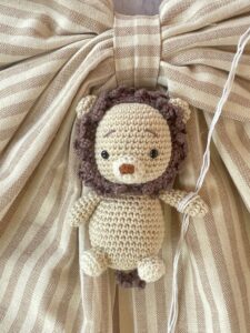 A completare la creazione, un tenero leoncino tridimensionale realizzato con la tecnica dell’amigurumi, simbolo di dolcezza e artigianalità.