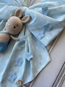 Il fiocco, in cotone celeste con fantasia nuvolette, è impreziosito da stelline ricamate in pannolenci che formano il nome del bimbo.