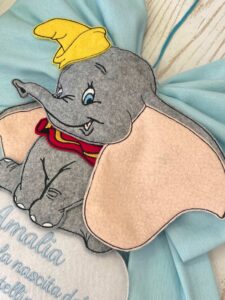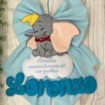 Al fiocco è applicato il dolcissimo Dumbo in pannolenci, posizionato su una nuvoletta bianca dove le lettere formano la frase “è nato” o dove è possibile ricamare una frase.. Dal fiocco pende il nome del bimbo in pannolenci azzurro, per un tocco personalizzato e raffinato.