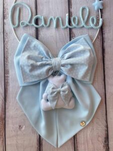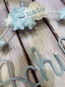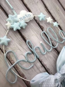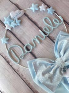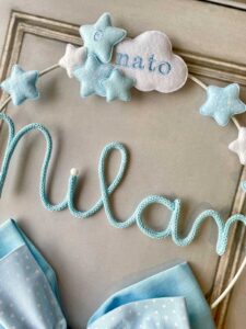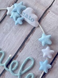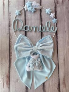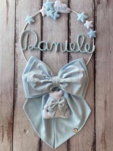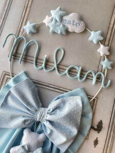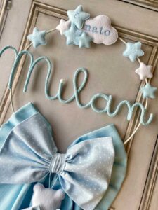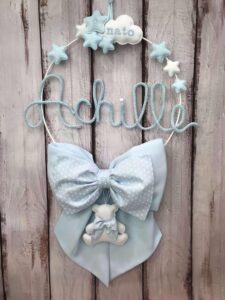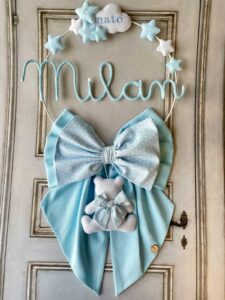 Il fiocco, in cotone celeste, è impreziosito da un fiocco più piccolo con fantasia cuoricini e da un cerchio in metallo bianco decorato con nuvoletta e stelline in pannolenci, su cui è ricamata la scritta “è nato”.