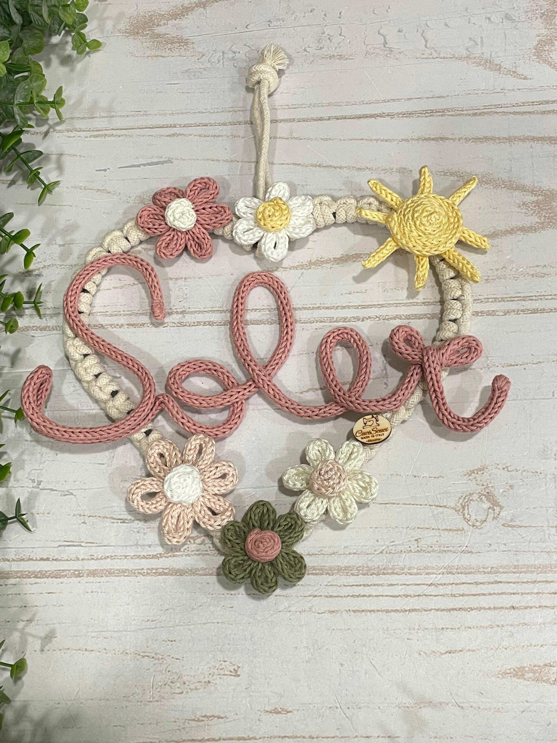Il cuore, rivestito in crochet color panna, è impreziosito da piccoli fiori in crochet dai toni vivaci, che donano armonia e dolcezza alla composizione.