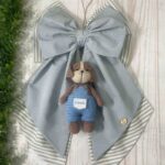 Il fiocco nascita, realizzato in cotone tinto filo color nuvola a righe, è confezionato interamente a mano dalla nostra sartoria con cura e attenzione artigianale.