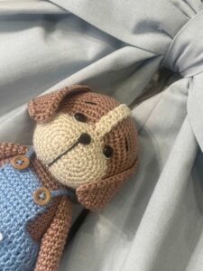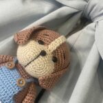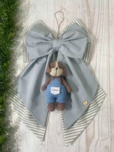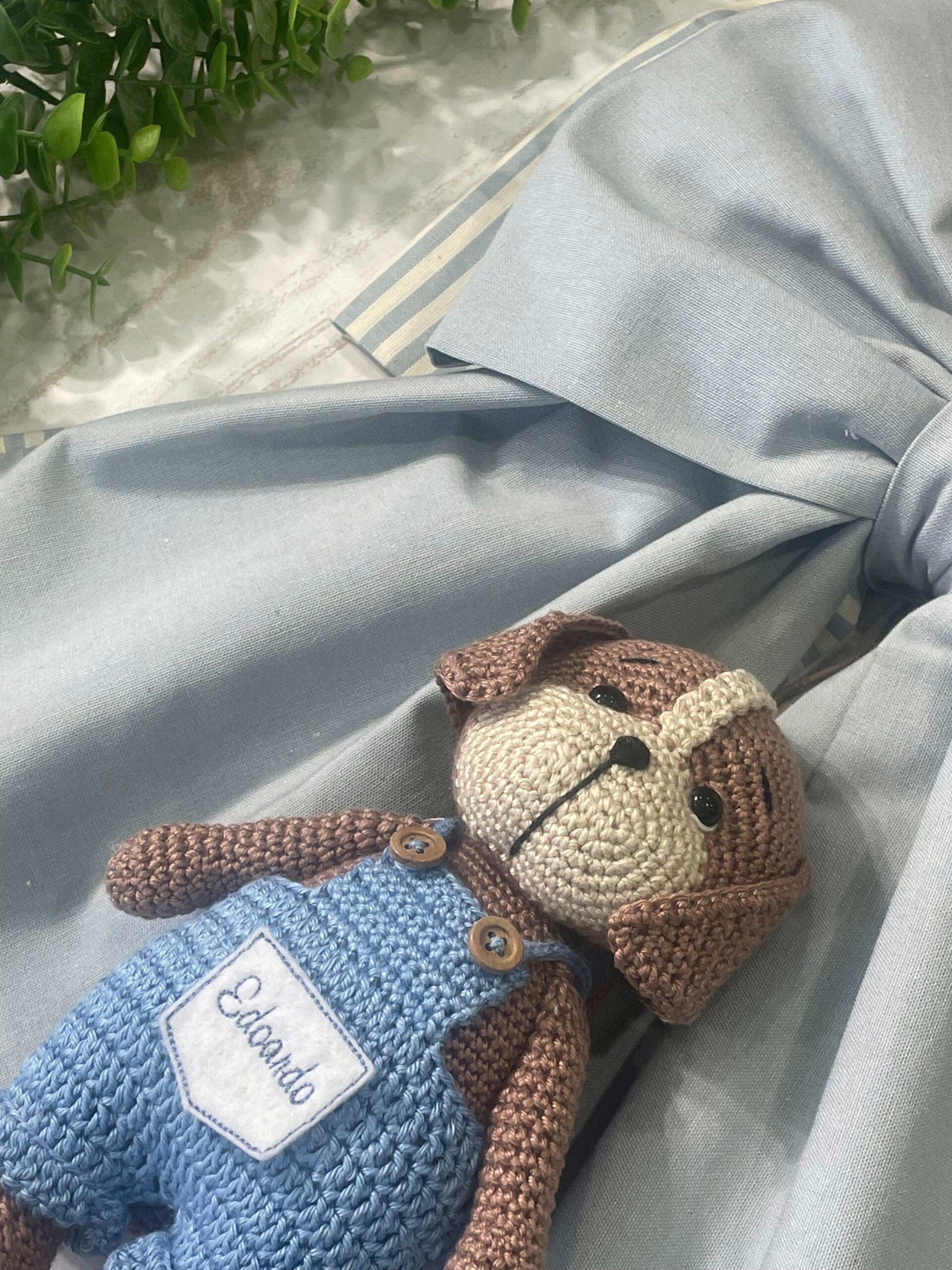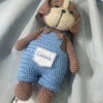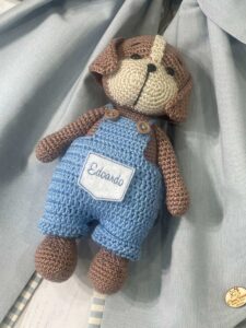 Dal fiocco pende un tenero cagnolino realizzato con la tecnica amigurumi, impreziosito da una dolce salopette sulla cui tasca è ricamato il nome del bimbo, dettaglio che rende la creazione unica e speciale.