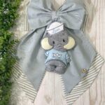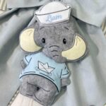 Dal fiocco pende un tenero elefantino realizzato in pannolenci tridimensionale, vestito con una dolce t-shirt azzurra e un piccolo cappello da marinaio, sul quale è ricamato il nome del bambino, dettaglio che rende la creazione unica e speciale.