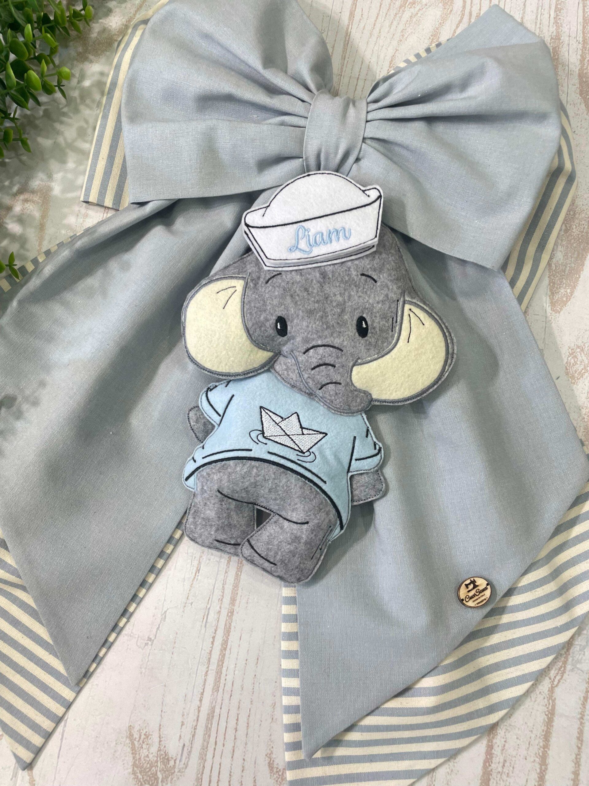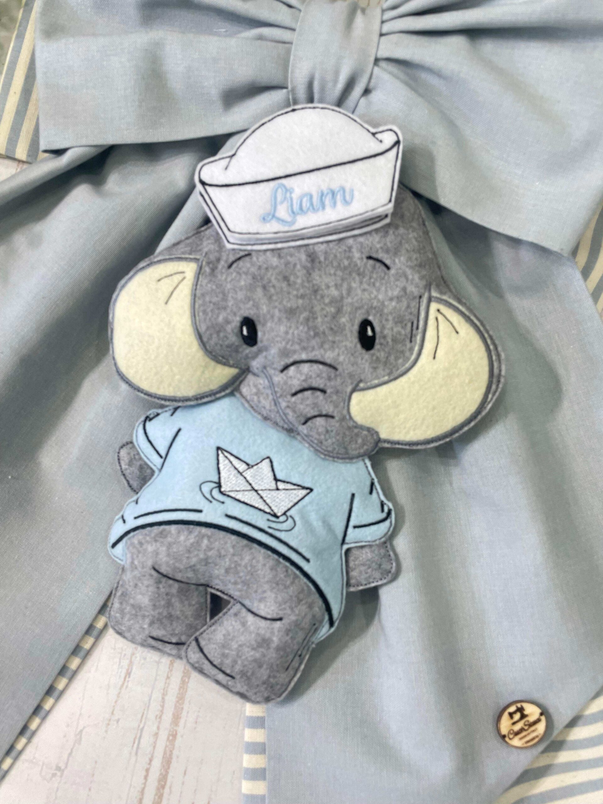 Dal fiocco pende un tenero elefantino realizzato in pannolenci tridimensionale, vestito con una dolce t-shirt azzurra e un piccolo cappello da marinaio, sul quale è ricamato il nome del bambino, dettaglio che rende la creazione unica e speciale.