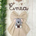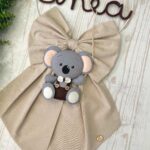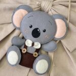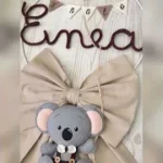 Dal fiocco pende un tenero koala tridimensionale in pannolenci, che regge un filo collegato ai palloncini nella parte superiore, creando un dettaglio originale e ricco di movimento.