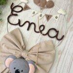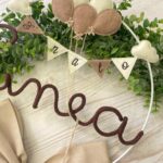 Nella parte superiore del cerchio, la frase “È nato” è ricamata su delicate bandierine, mentre al centro spicca il nome del bimbo in tricotin marrone.