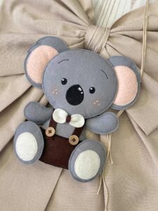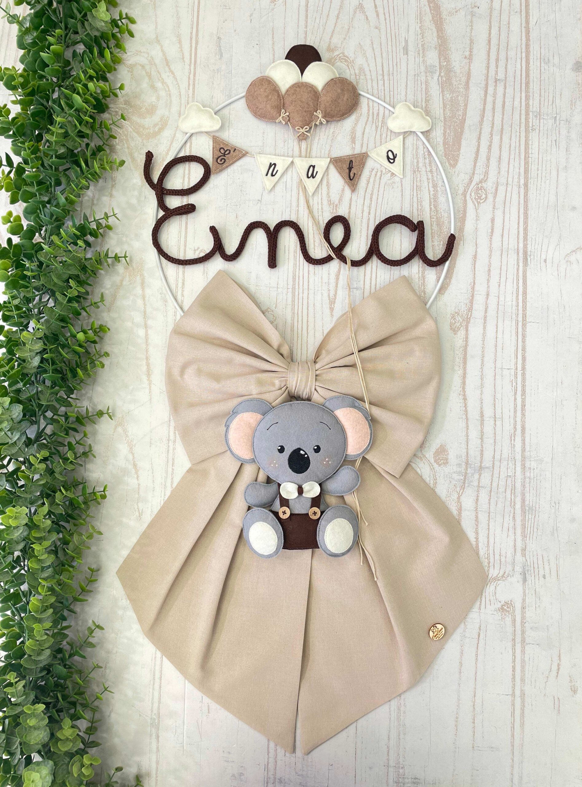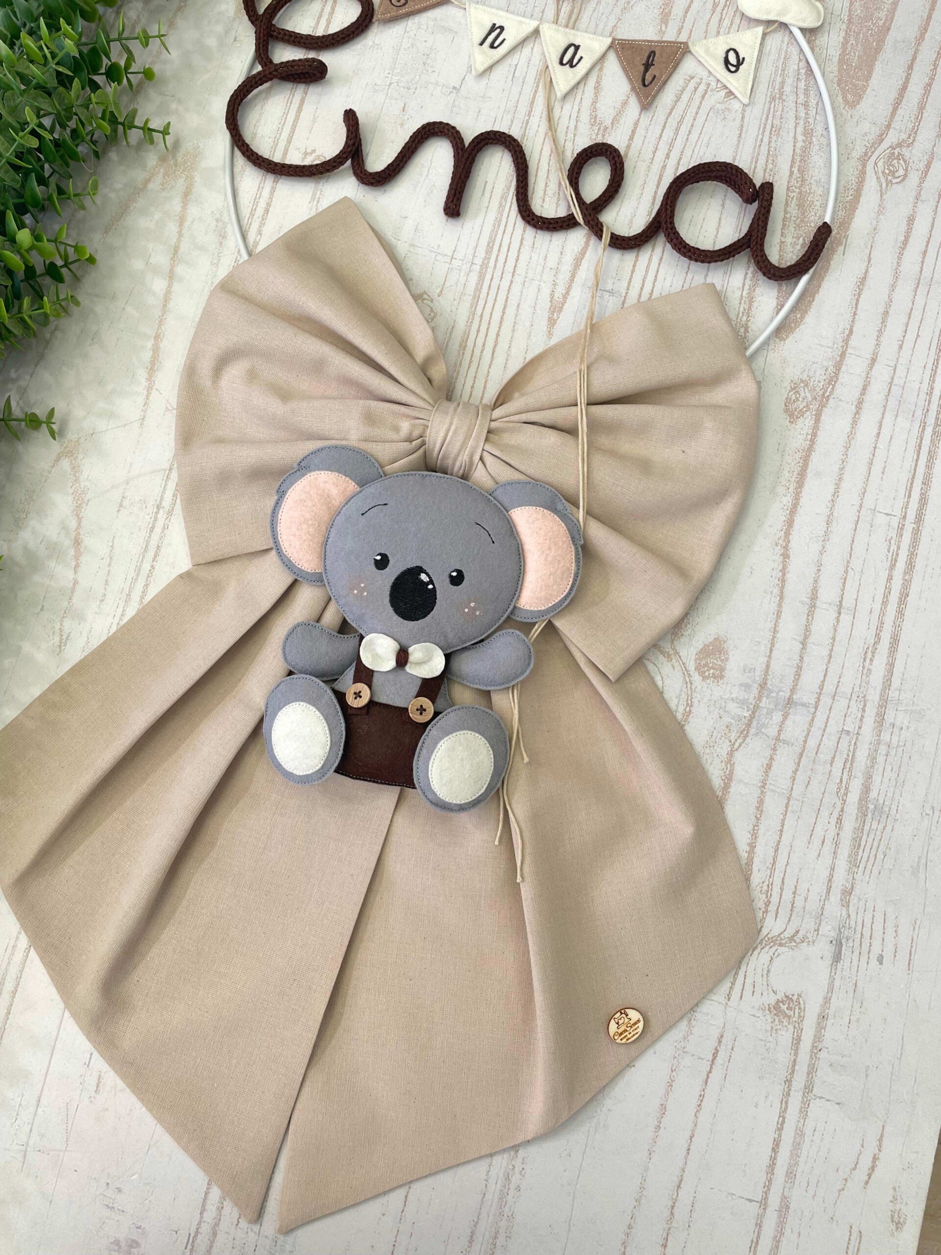 Dal fiocco pende un tenero koala tridimensionale in pannolenci, che regge un filo collegato ai palloncini nella parte superiore, creando un dettaglio originale e ricco di movimento.
