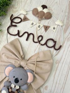 Nella parte superiore del cerchio, la frase “È nato” è ricamata su delicate bandierine, mentre al centro spicca il nome del bimbo in tricotin marrone.