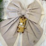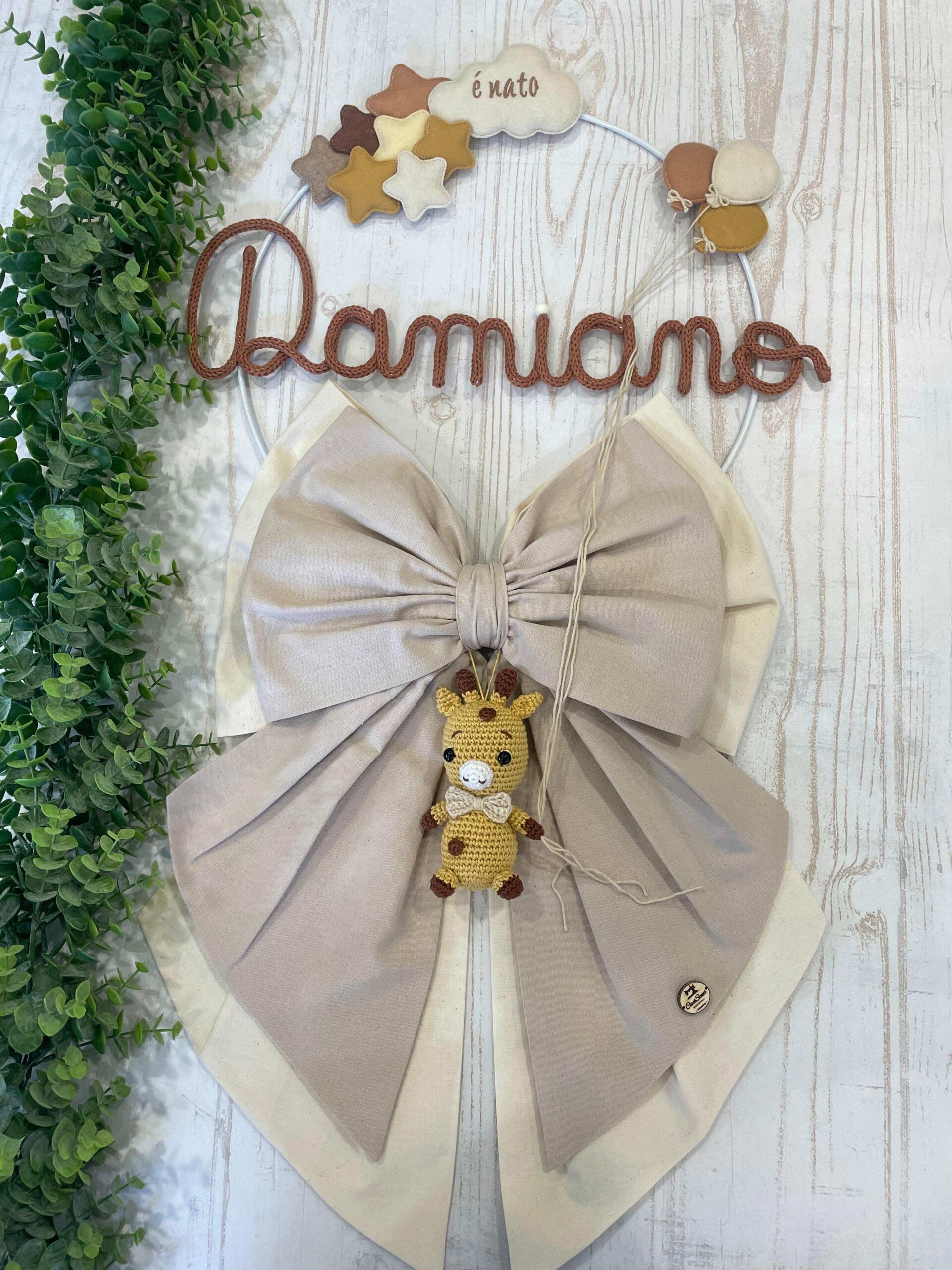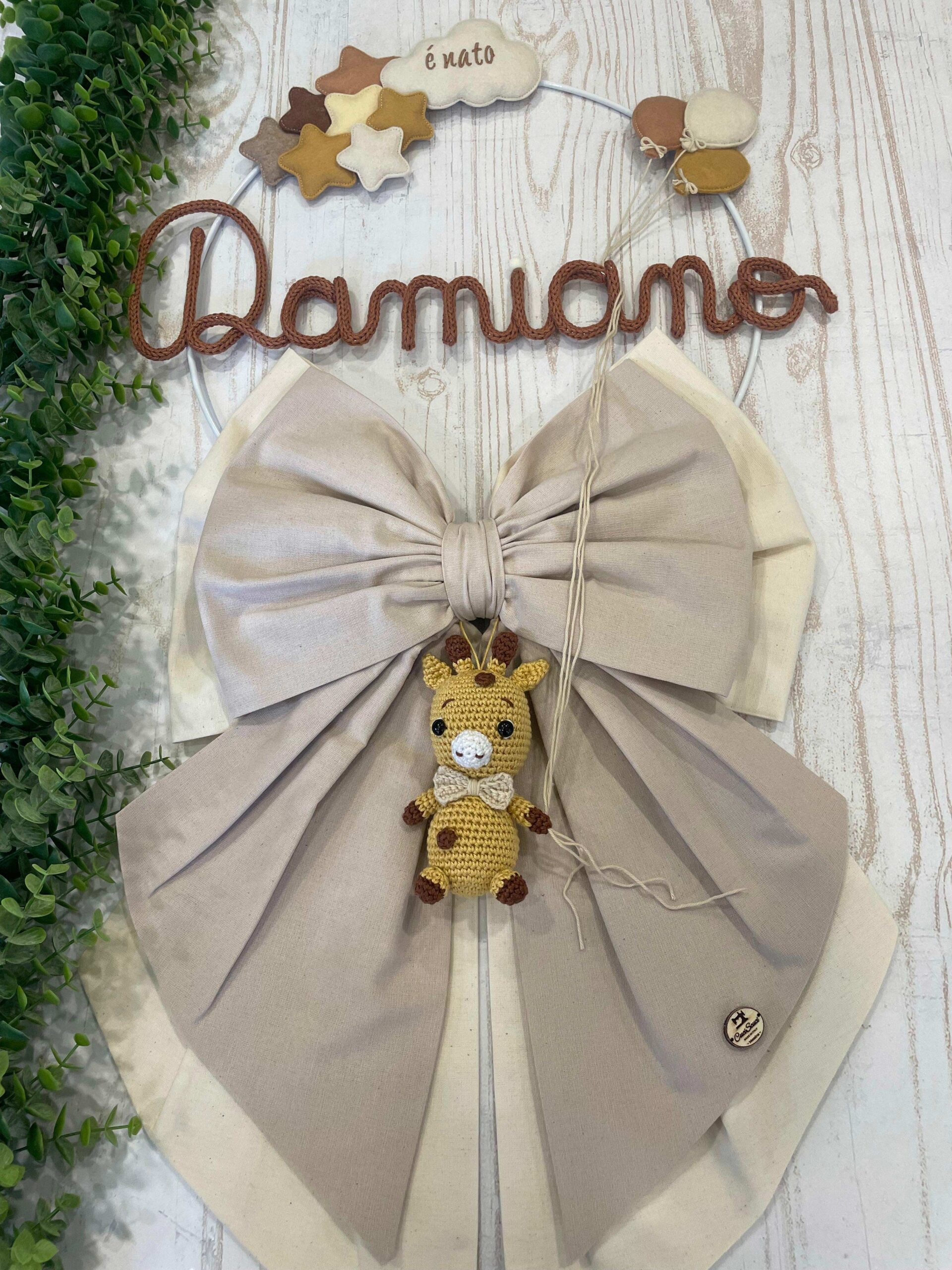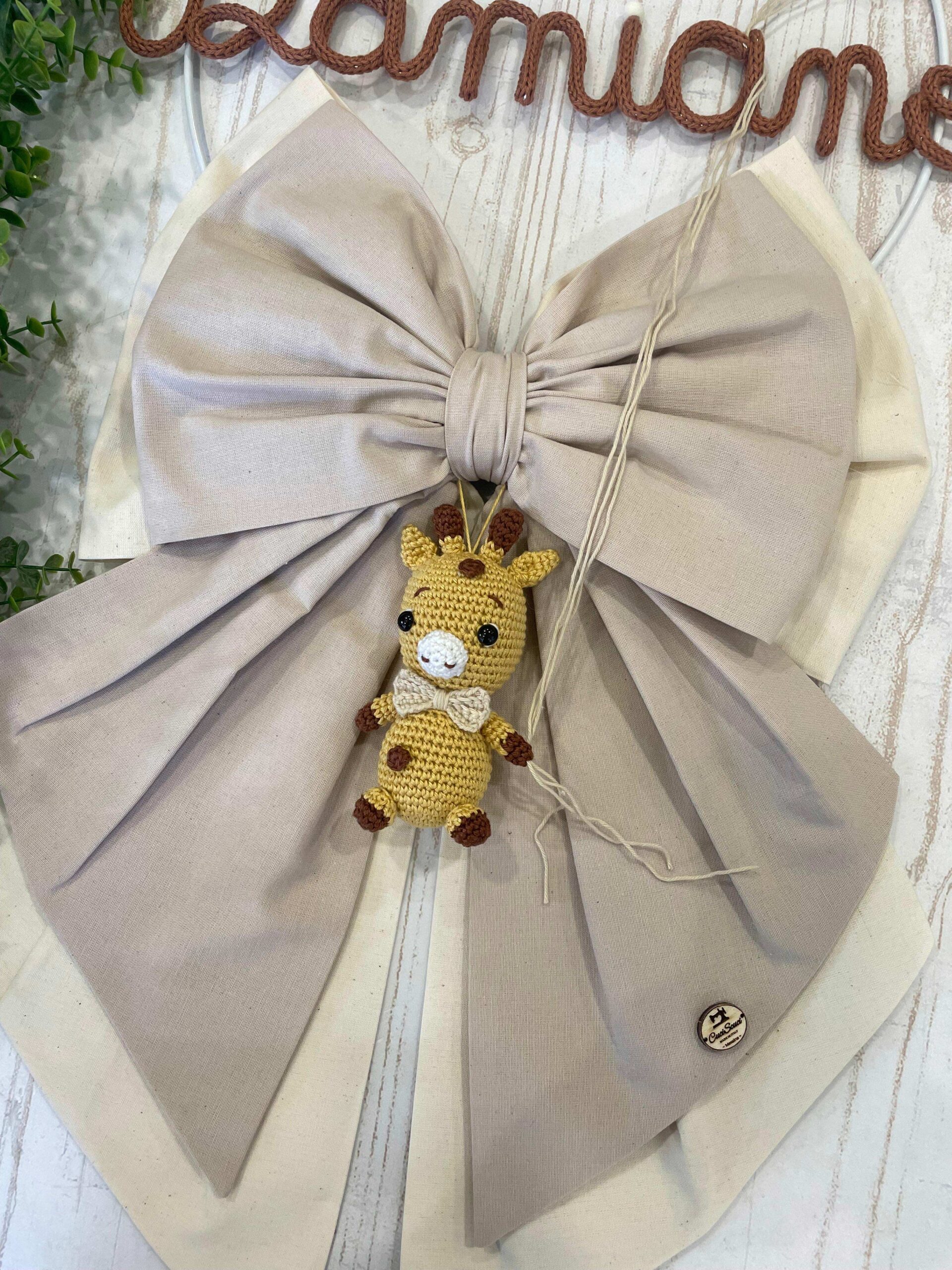 Dal fiocco pende una tenerissima giraffa realizzata a mano con la tecnica amigurumi, morbida e ricca di dettagli, che rende questa creazione ancora più unica.