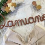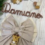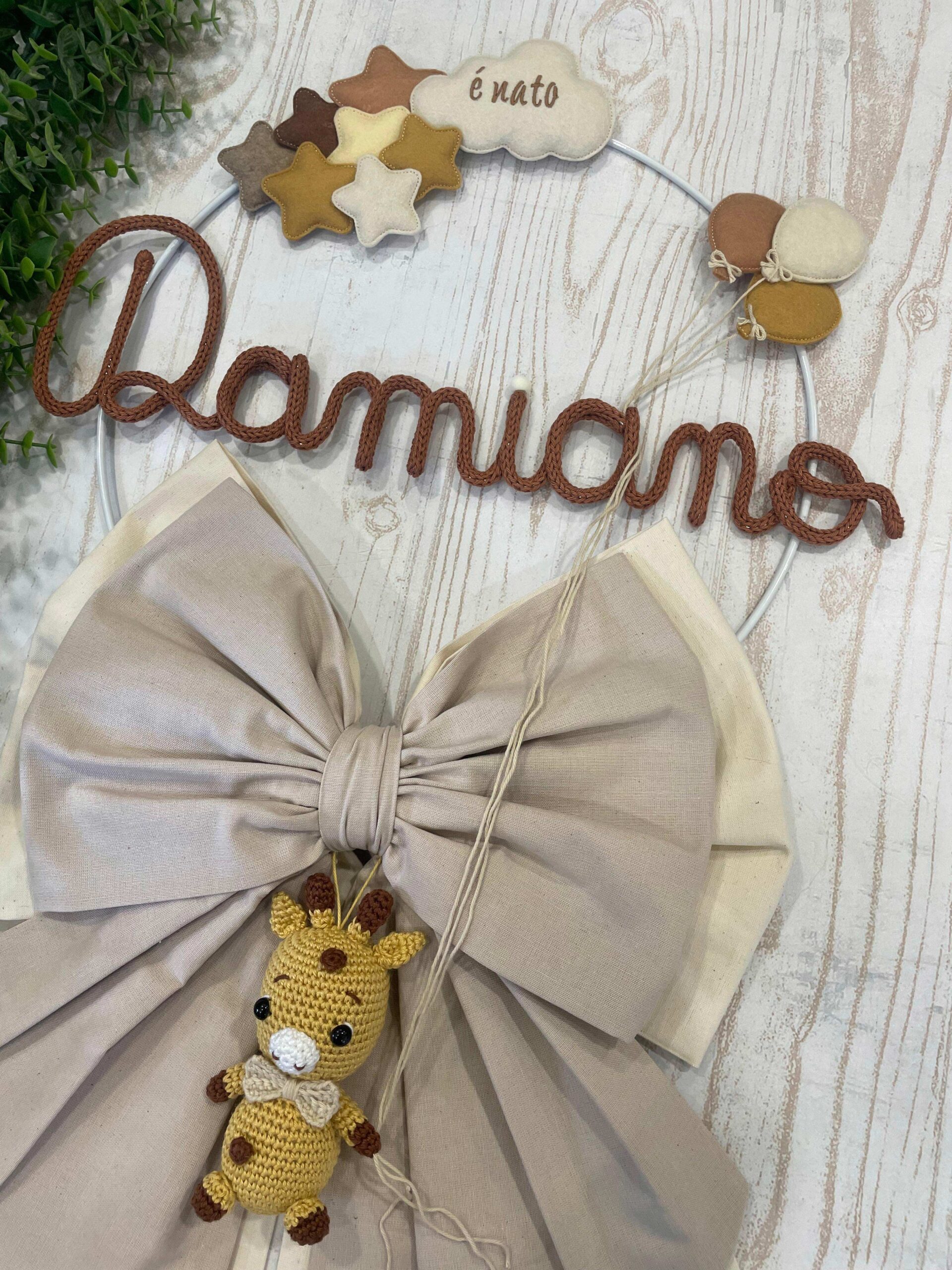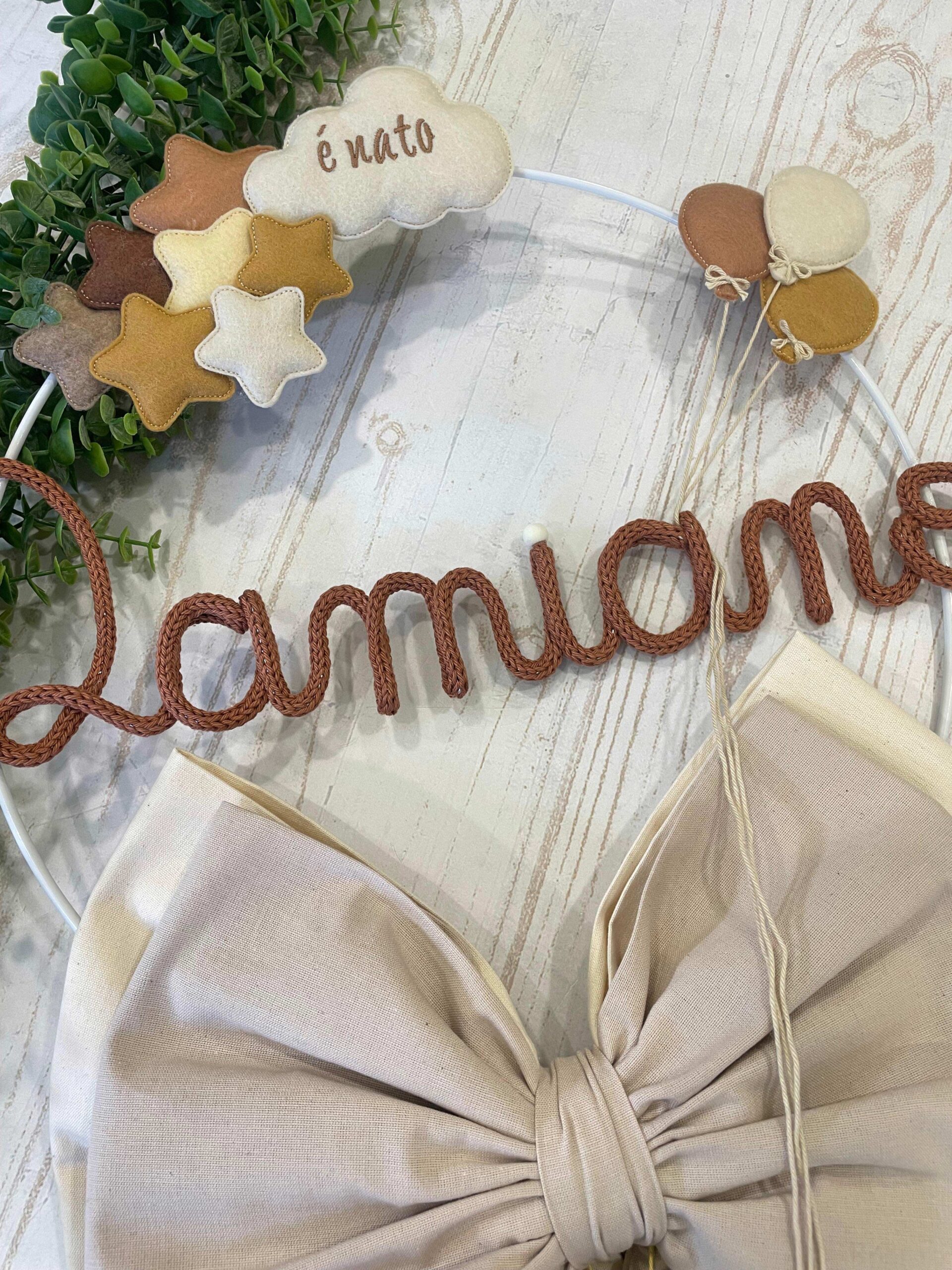 Al centro spicca il nome del bimbo, modellato a mano in tricotin marrone, creando un effetto raffinato e personalizzato.