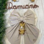 Un fiocco nascita caldo ed elegante, realizzato interamente a mano in un raffinato cotone color nocciola adagiato su un fiocco più grande color panna per un delicato gioco di tonalità.