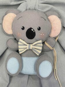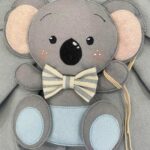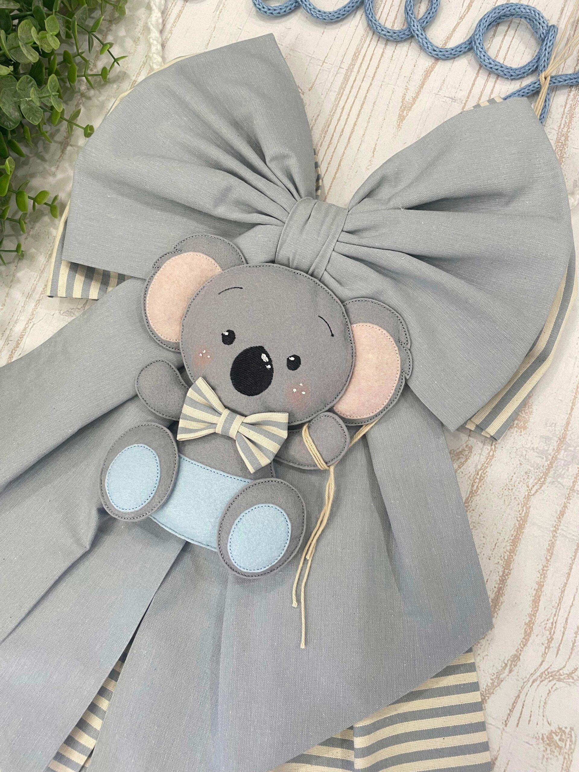 Dal fiocco pende un tenero koala in pannolenci tridimensionale, che dona un tocco giocoso e raffinato.