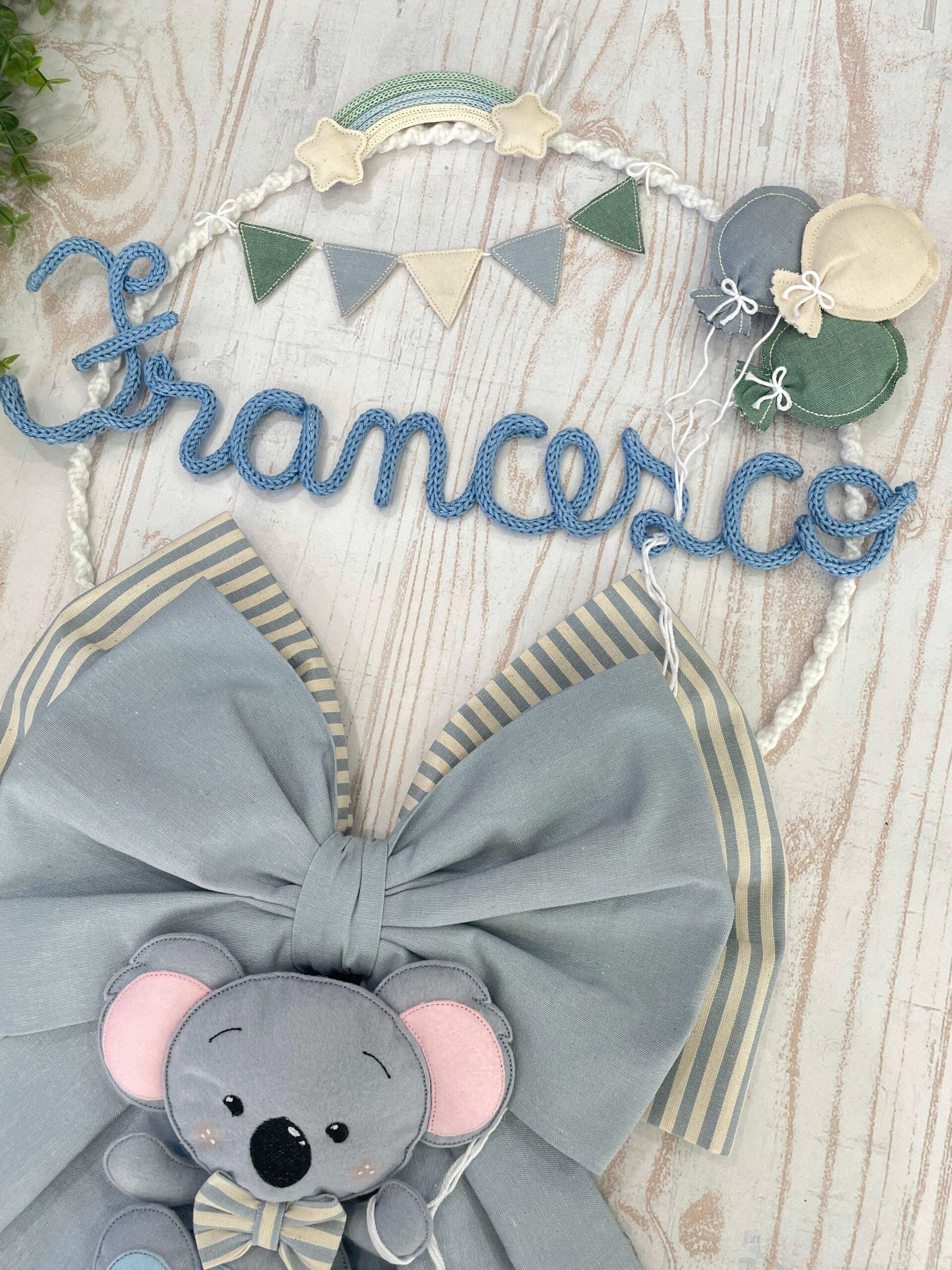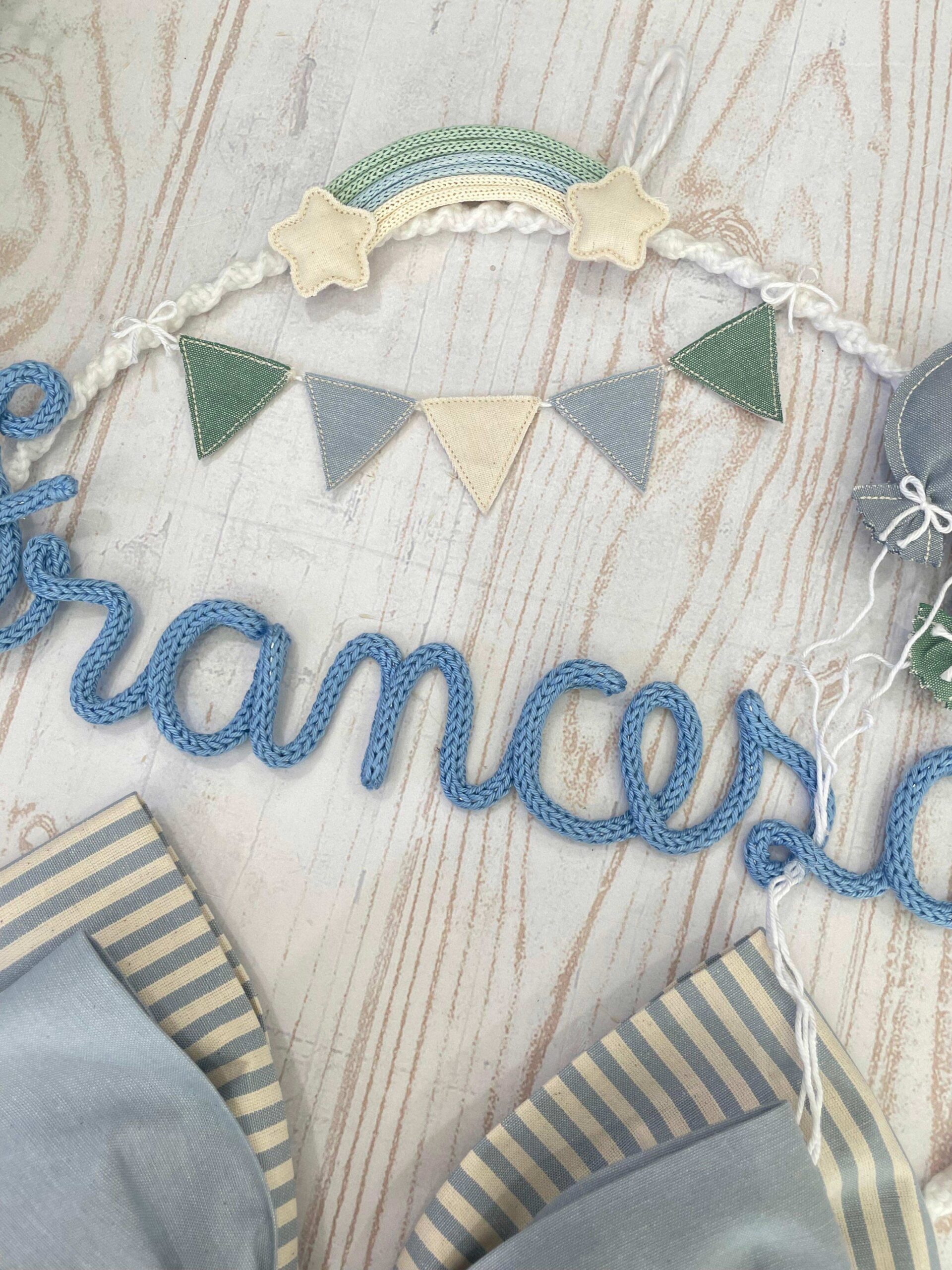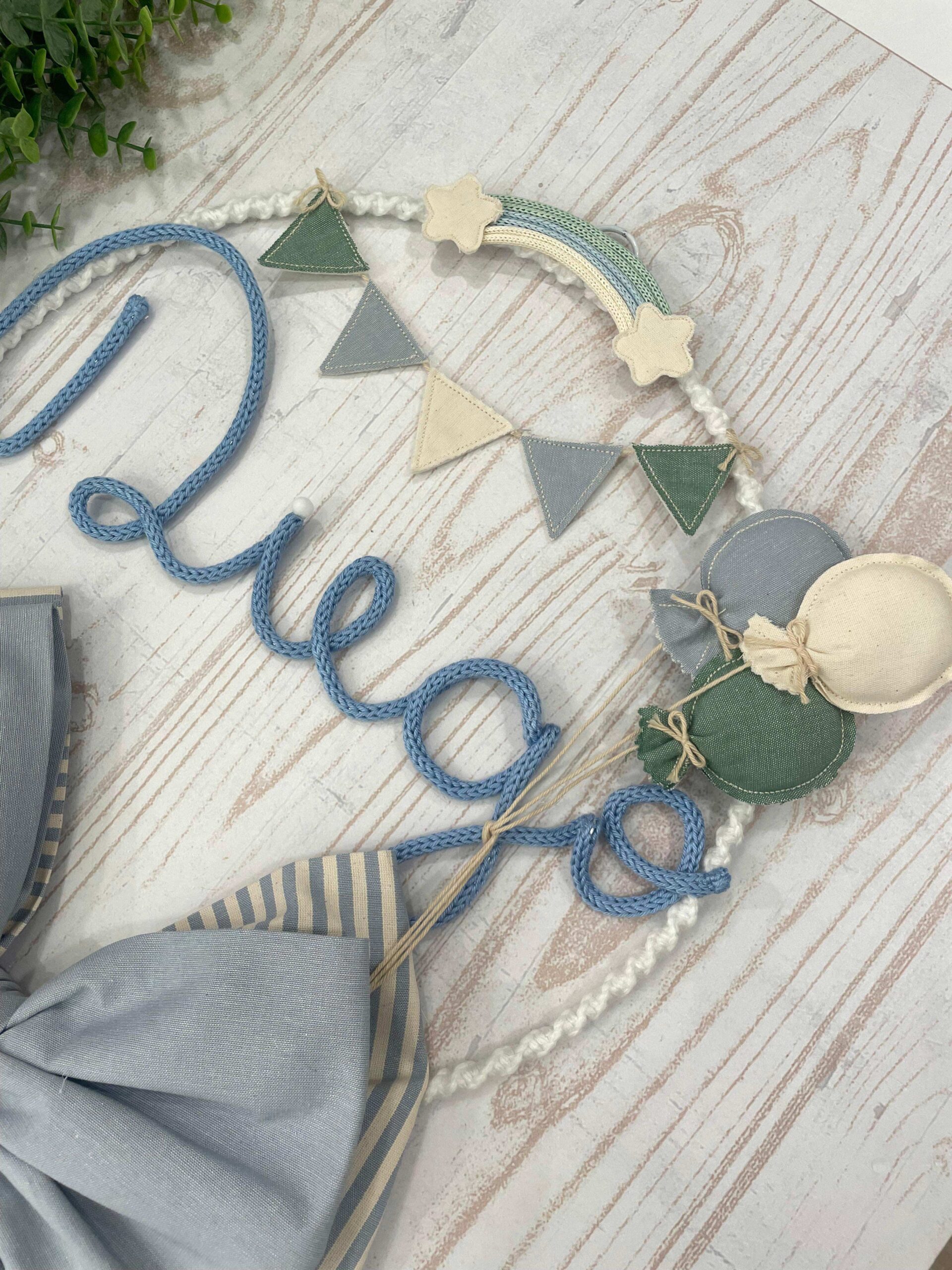 Un cerchio in metallo bianco, rivestito in macramè e decorato con tessuti coordinati, incornicia con eleganza il nome del bimbo, realizzato in tricotin azzurro.