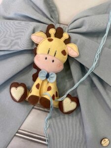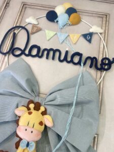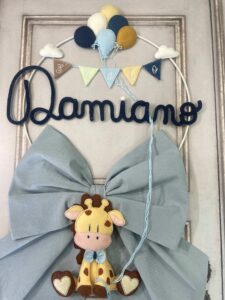 Al centro è presente il nome del bimbo in tricotin blu, e nella parte inferiore pende una tenerissima giraffa tridimensionale, che regge un filo collegato ai palloncini.