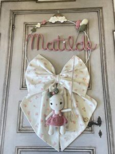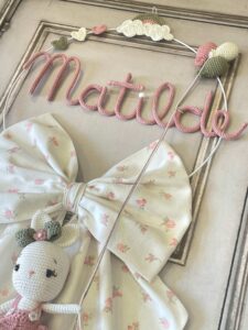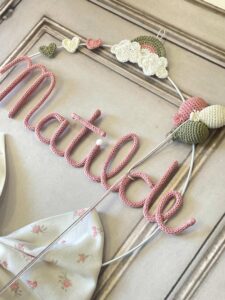 Un cerchio in metallo bianco, arricchito da delicati decori in crochet, incornicia con eleganza il nome della bimba in tricotin rosa antico.