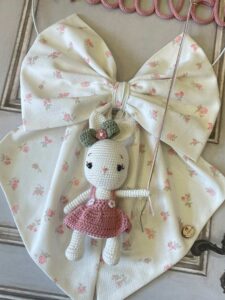 Dal fiocco pende una tenerissima coniglietta realizzata a mano con la tecnica amigurumi, per un tocco dolce e raffinato.