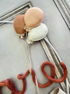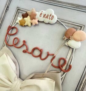 Il fiocco presenta un cerchio in metallo bianco decorato con soggetti in pannolenci, al centro il nome del bimbo in tricotin marrone e un tenero leoncino tridimensionale realizzato con la tecnica amigurumi, per un effetto originale e delicato.