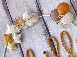 Un cerchio in metallo bianco decorato con stelline, palloncini e una nuvola con la scritta ricamata “è nato”, in pannolenci, incornicia il nome del bimbo o della bimba, realizzato in tricotin color senape.