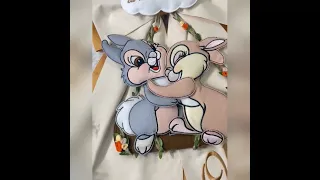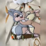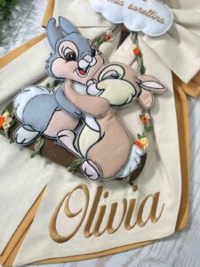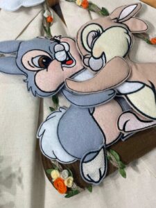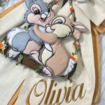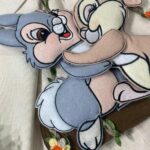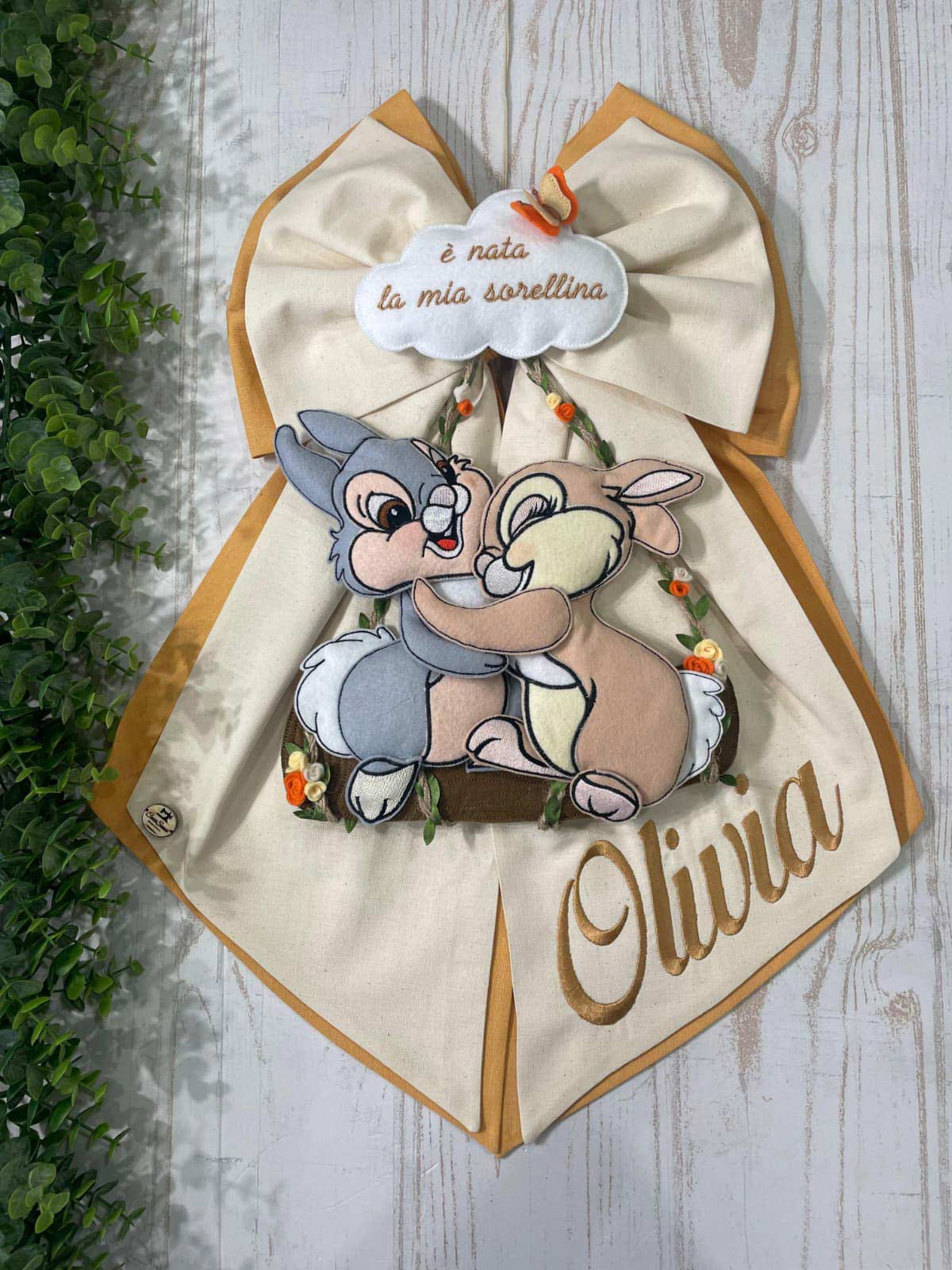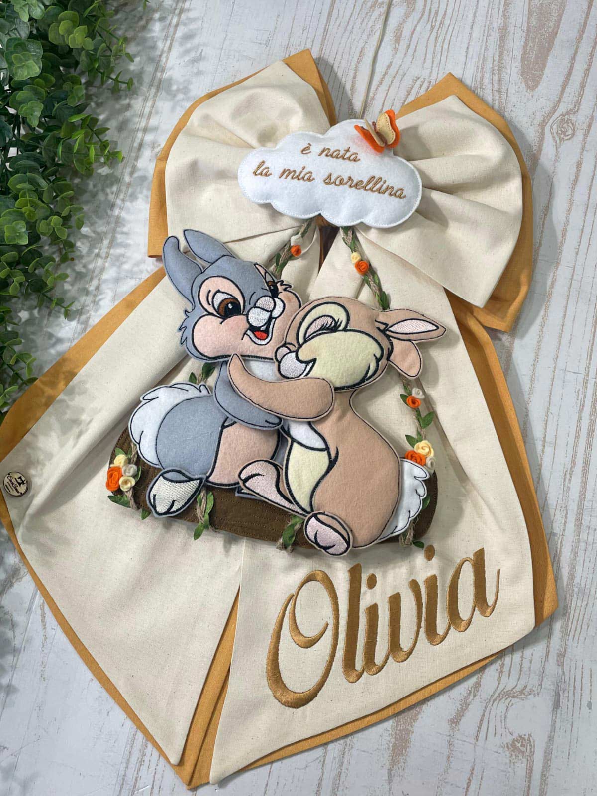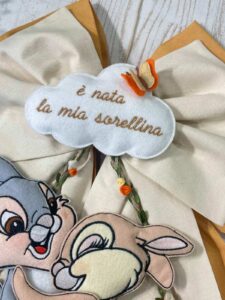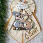 Dal fiocco pendono i teneri coniglietti Disney Tamburino e Miss Bunny, realizzati in pannolenci tridimensionale, che donano movimento e dolcezza all’insieme.