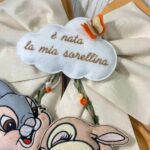 Sul fiocco più piccolo è ricamato il nome del bimbo/a, rendendo la creazione unica e personale.