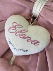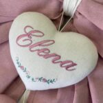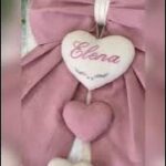 Dalla parte centrale pende un cuore in pannolenci ricamato con il nome della bambina, seguito da altri due cuori coordinati, che completano con grazia la composizione.