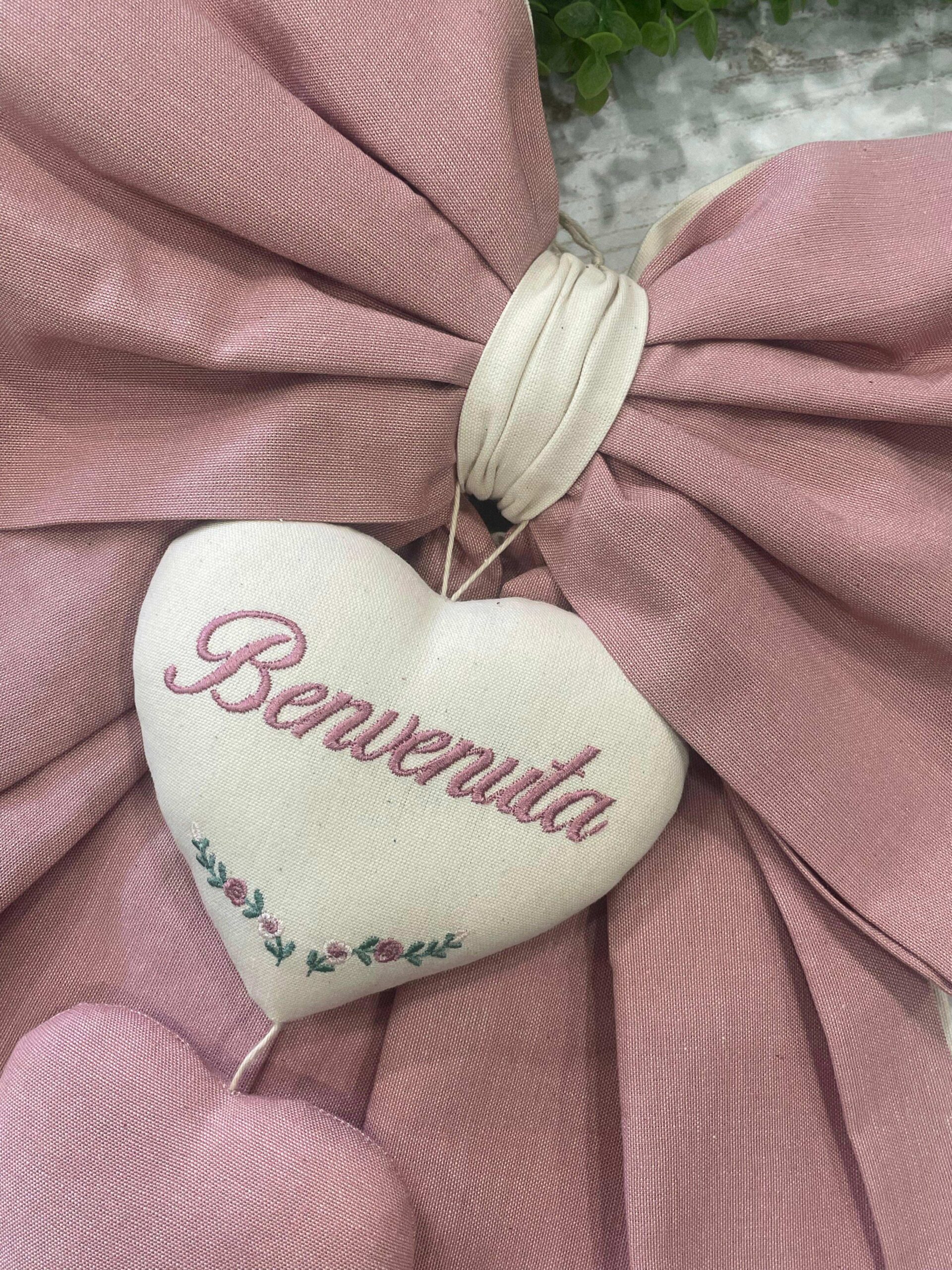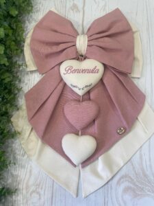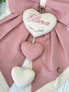 Recensisci per primo “Fiocco Nascita Rosa Antico e Panna con Ricamo e Cuori”