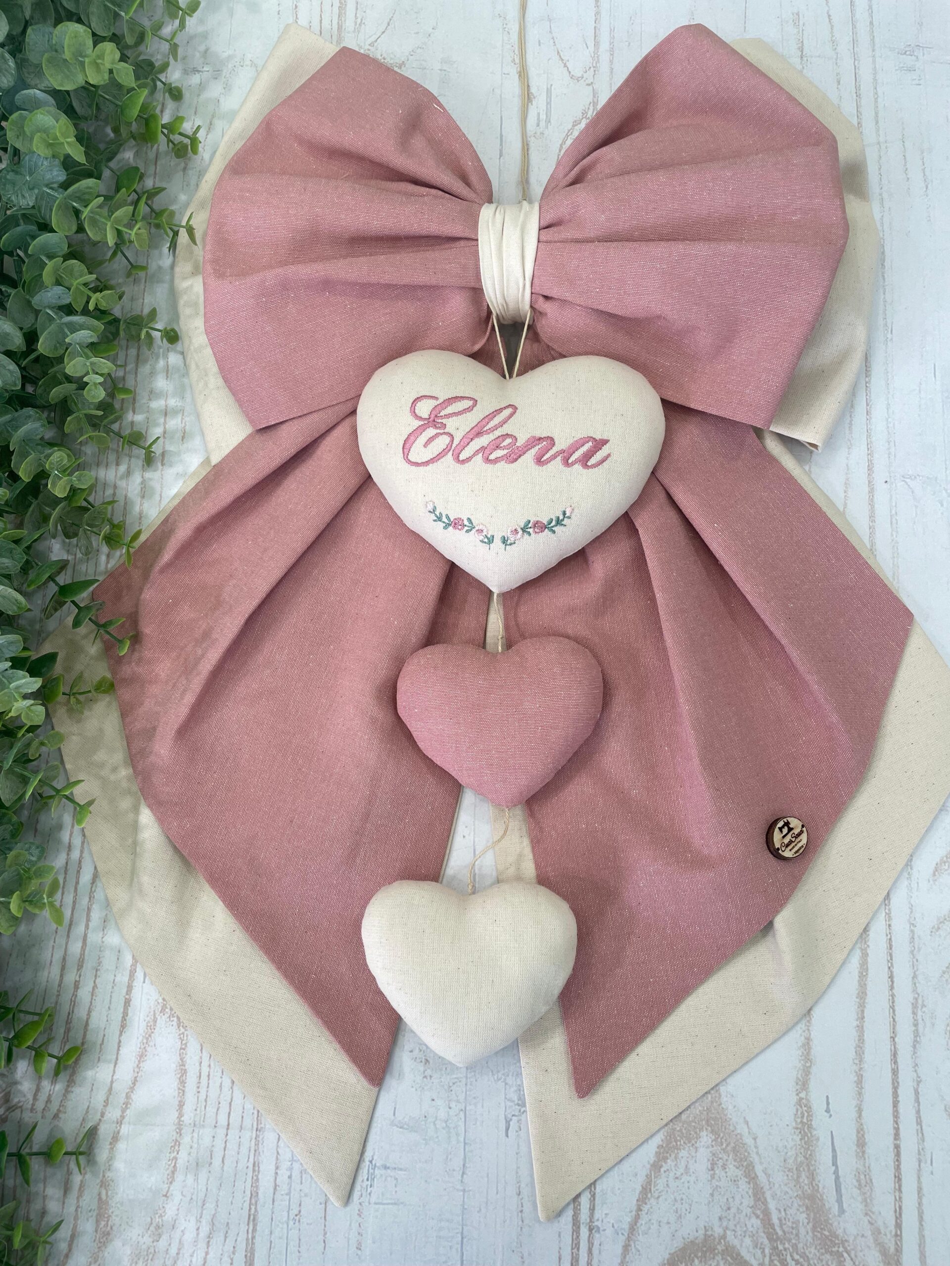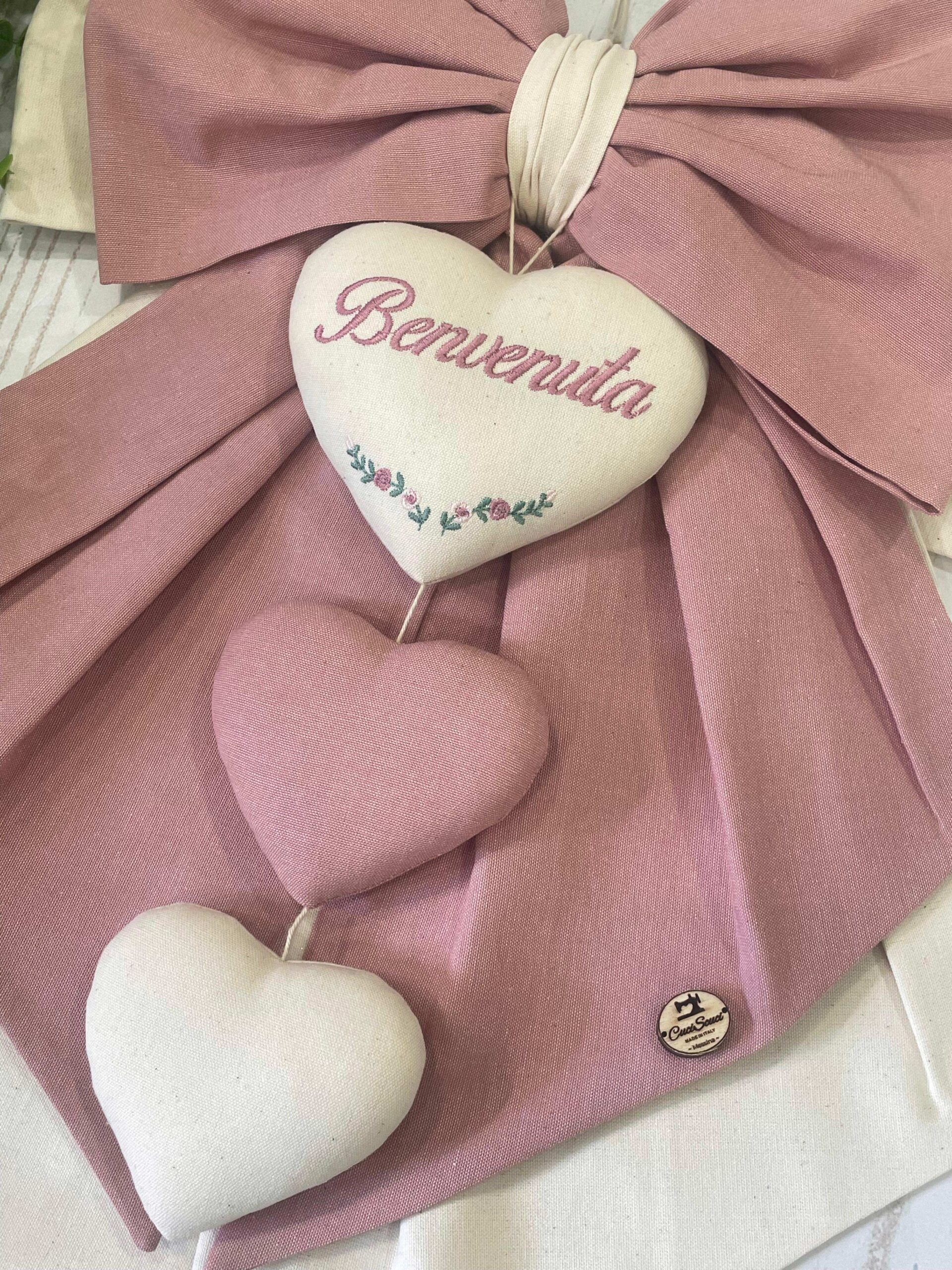 Fiocco Nascita Rosa Antico e Panna con Ricamo e Cuori