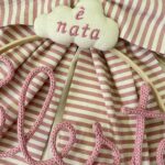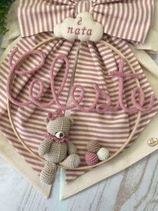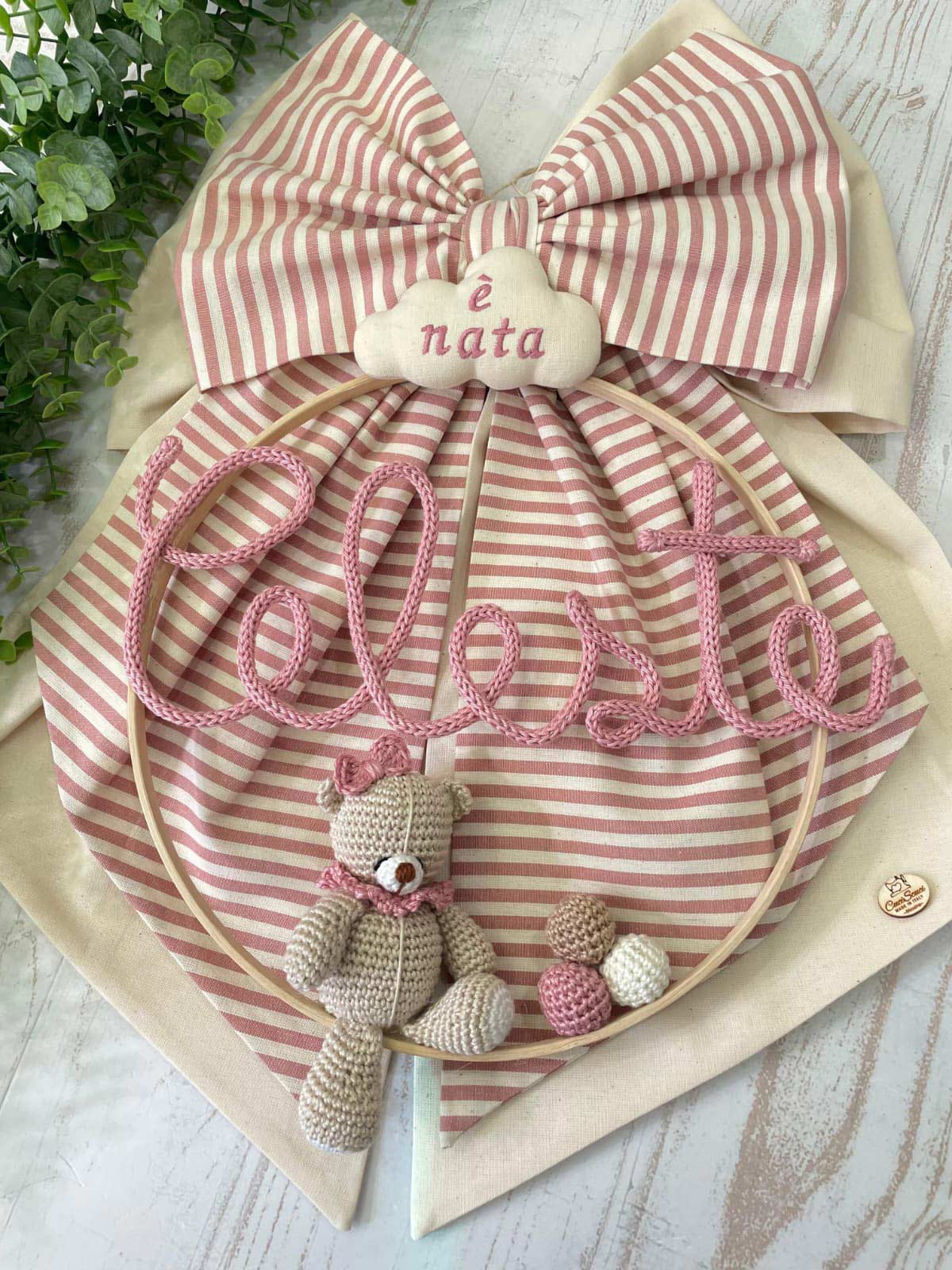 Dal fiocco pende un raffinato telaio con il nome in tricotin rosa, accompagnato da una tenera orsetta realizzata a mano con la tecnica amigurumi, che dona dolcezza e carattere a questo fiocco nascita.