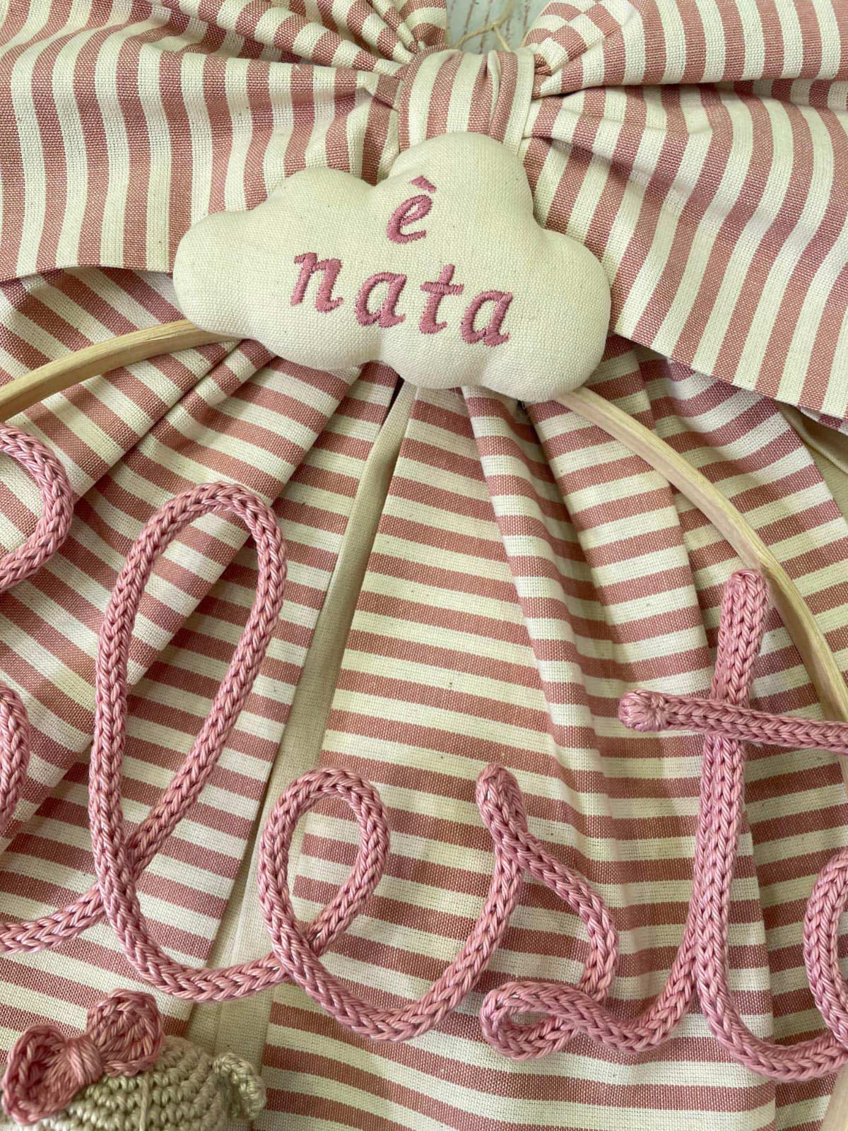 Il fiocco nascita, realizzato in cotone tinto filo color panna, prende forma attraverso una lavorazione interamente manuale curata dalla nostra sartoria.