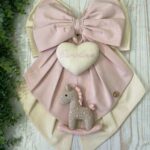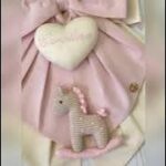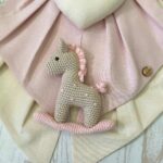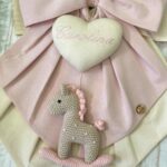 Al centro spicca un cuore in tessuto con il nome della bimba ricamato, da cui pende un tenero cavallino a dondolo realizzato a mano con la tecnica amigurumi, simbolo di tenerezza e tradizione.