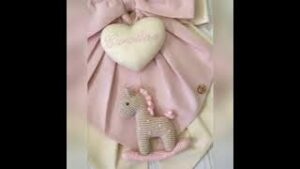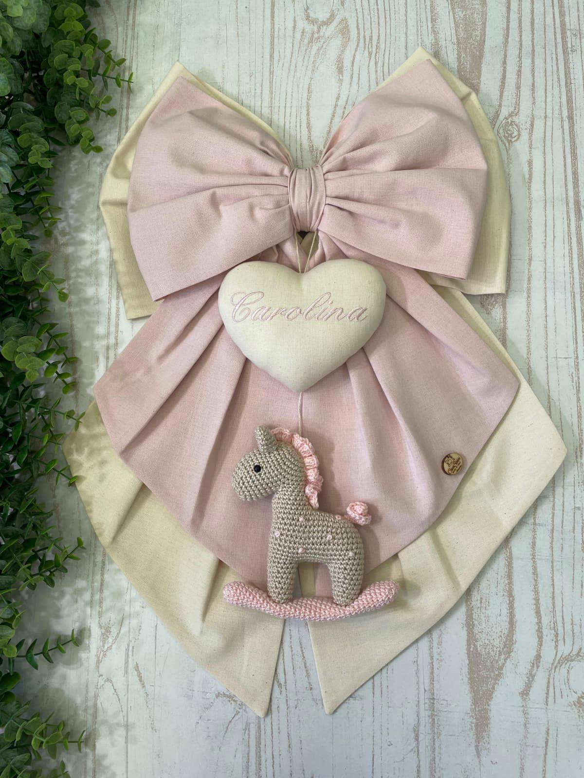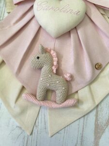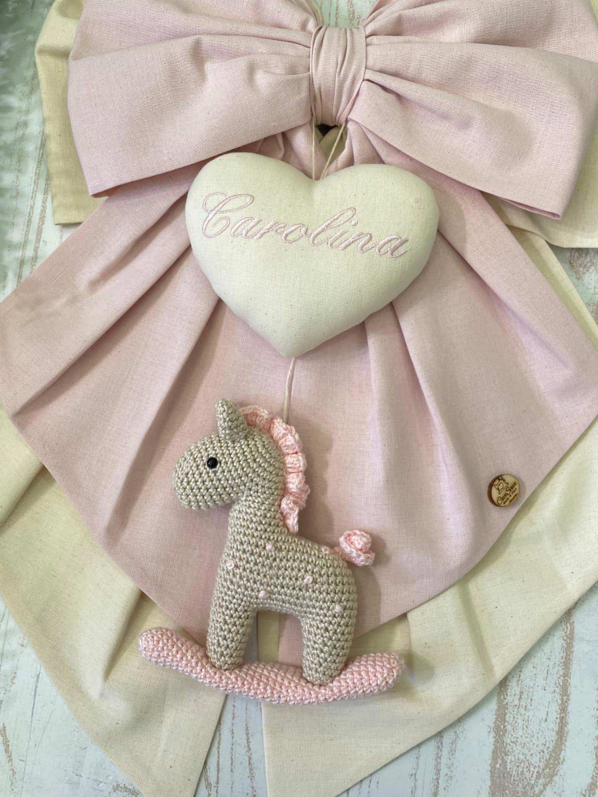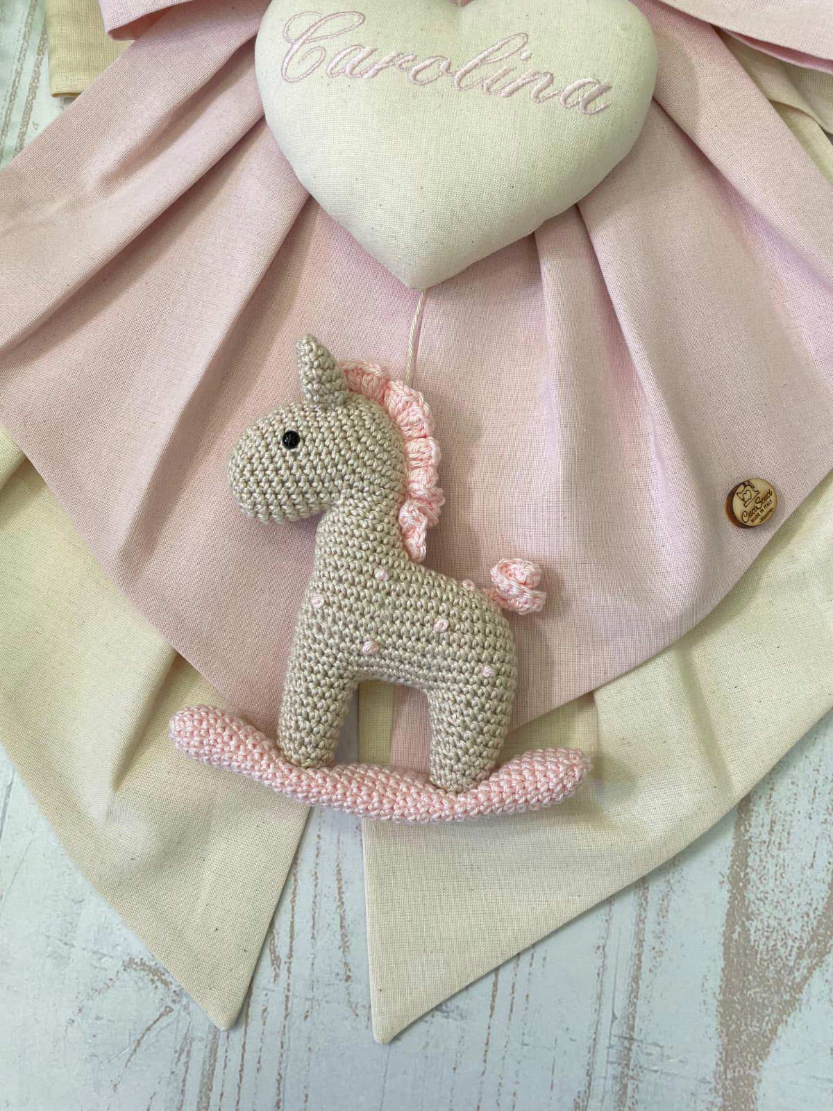 Al centro spicca un cuore in tessuto con il nome della bimba ricamato, da cui pende un tenero cavallino a dondolo realizzato a mano con la tecnica amigurumi, simbolo di tenerezza e tradizione.