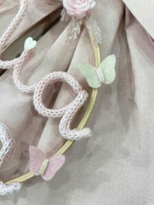 Dal fiocco pende un mini telaio con nome in tricotin rosa, arricchito da dolci decori in pannolenci, che rendono questa creazione unica e tenera nei dettagli.