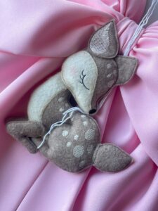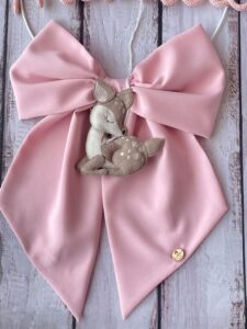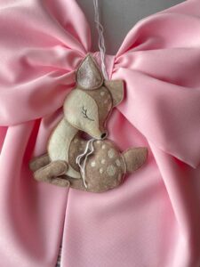 Dal fiocco pende un tenero cerbiatto tridimensionale in pannolenci, simbolo di dolcezza e originalità.