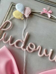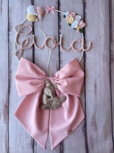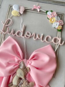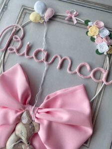 Il fiocco, in cotone rosa, è impreziosito da un cerchio in metallo bianco decorato con tre palloncini in pannolenci da un lato e fiori dall’altro, che incornicia il nome della bimba in tricotin rosa, personalizzabile.