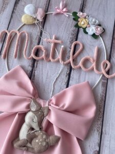 Fiocco Nascita Rosa con Cerbiatto, Fiori e Nome in Tricotin.