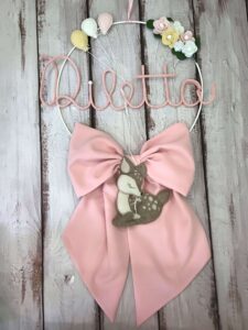 Fiocco Nascita Rosa con Cerbiatto, Fiori e Nome in Tricotin