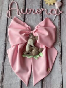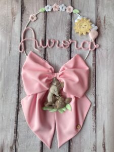 Un dolcissimo fiocco nascita realizzato interamente a mano dalla nostra sartoria, con cura e amore per ogni dettaglio.