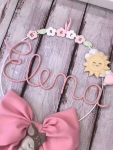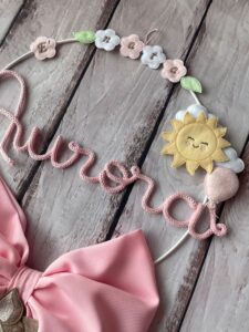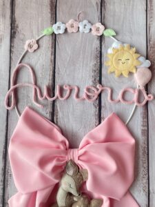 Il fiocco in cotone rosa è impreziosito da un cerchio in metallo bianco decorato con due nuvolette e un sole sorridente in pannolenci, che fanno da cornice a questo originale e tenero annuncio.
