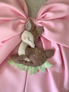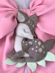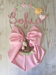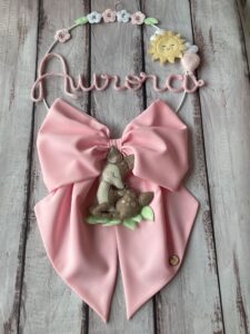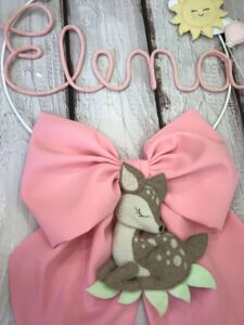 Al centro spicca il nome della bimba realizzato in tricotin rosa, mentre dal fiocco pende un cerbiatto tridimensionale in pannolenci, creando un effetto delicato e fiabesco.