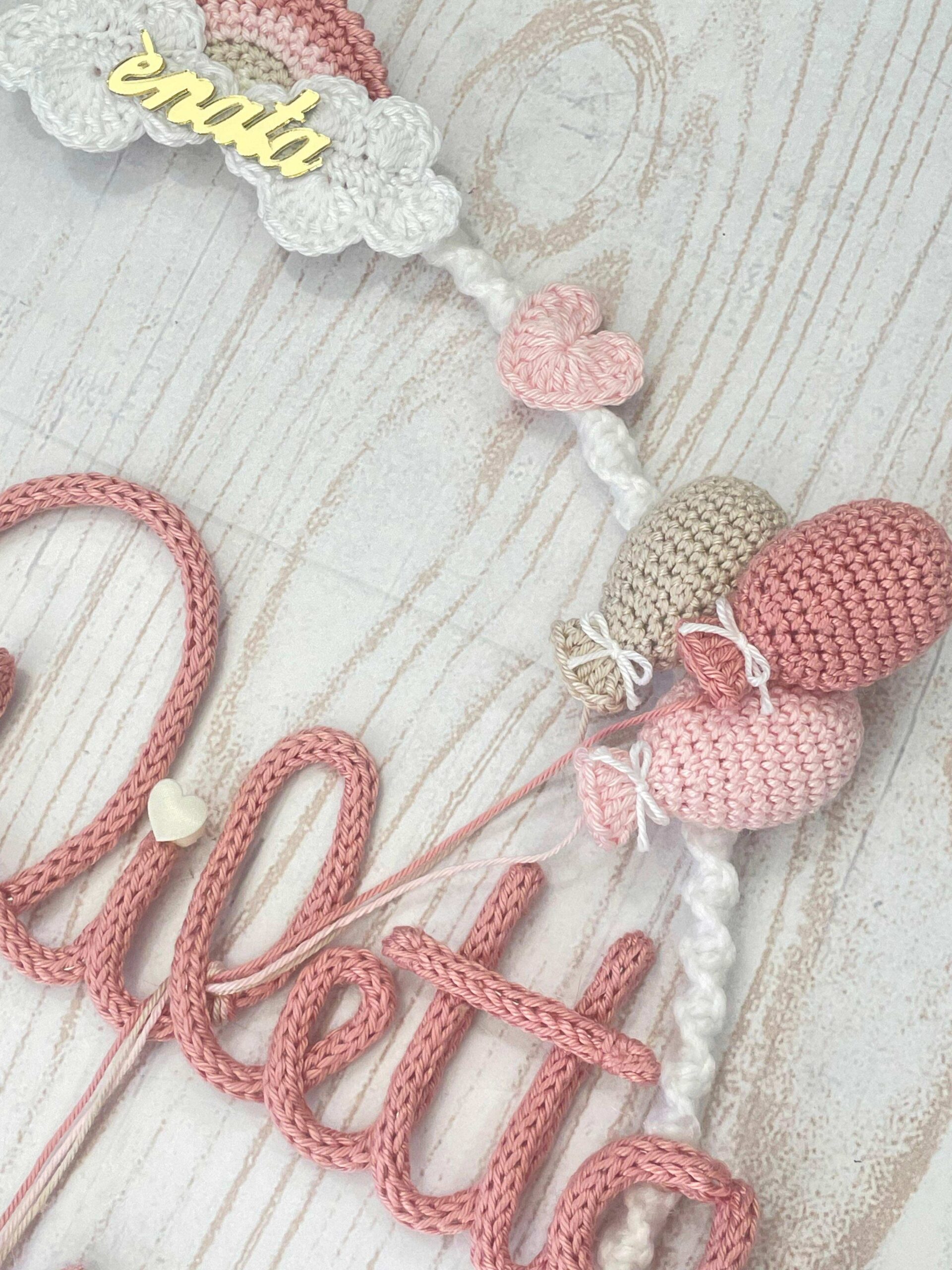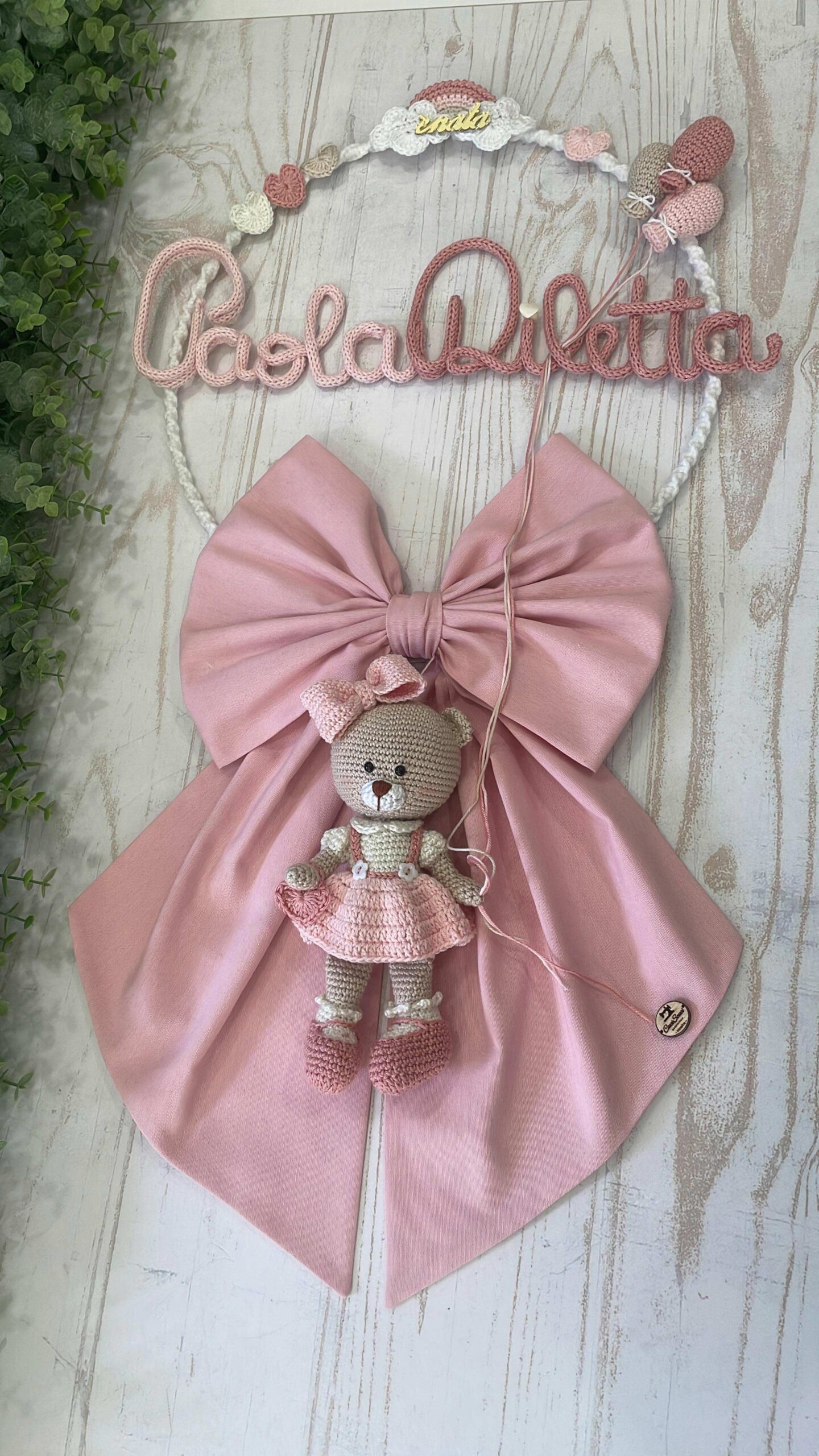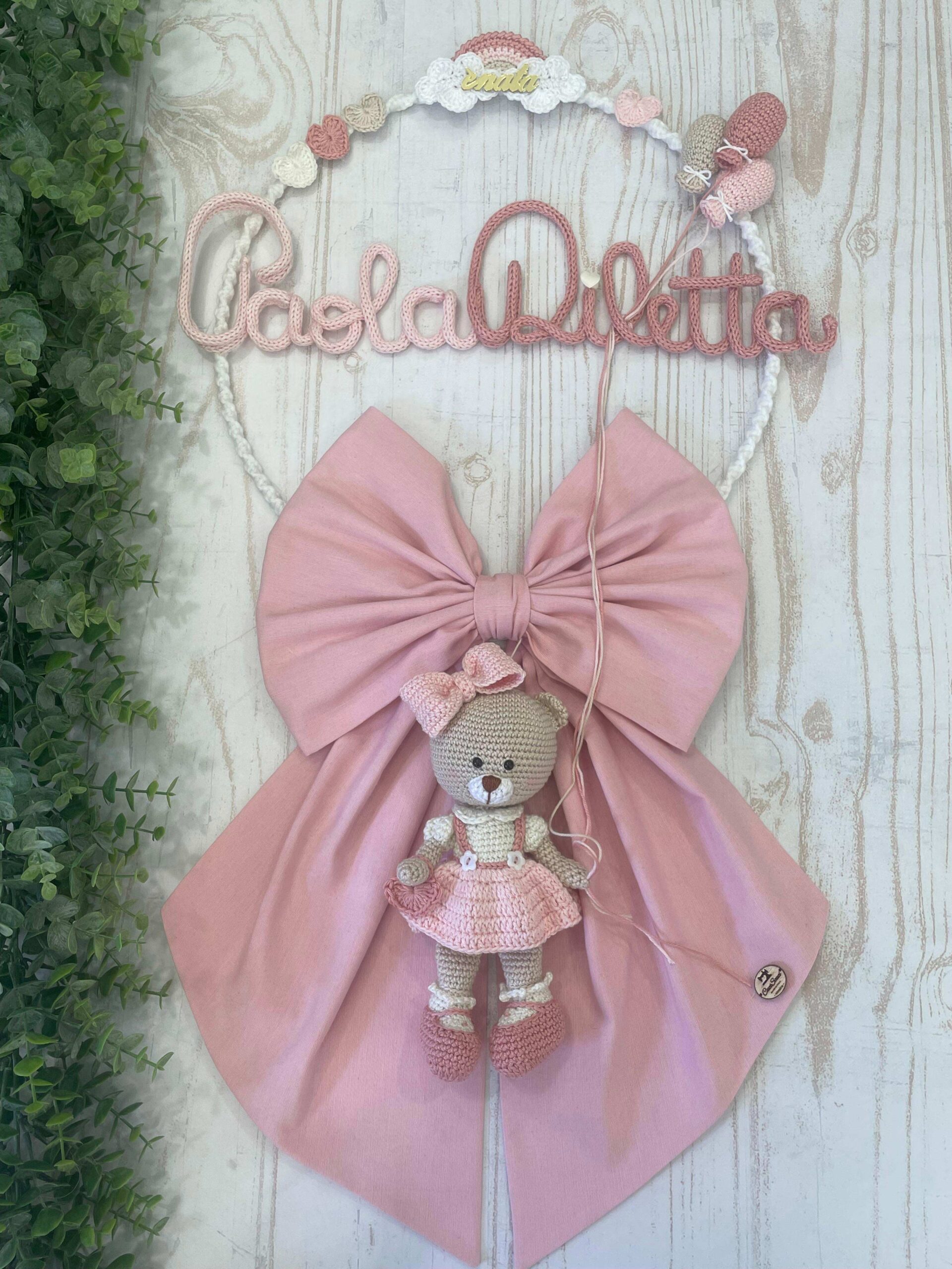 Al centro risaltano due nomi in tricotin nei toni del rosa, personalizzabili secondo le tue esigenze, mentre dal fiocco pende una dolcissima orsetta realizzata a mano con la tecnica amigurumi — simbolo di tenerezza e accoglienza.