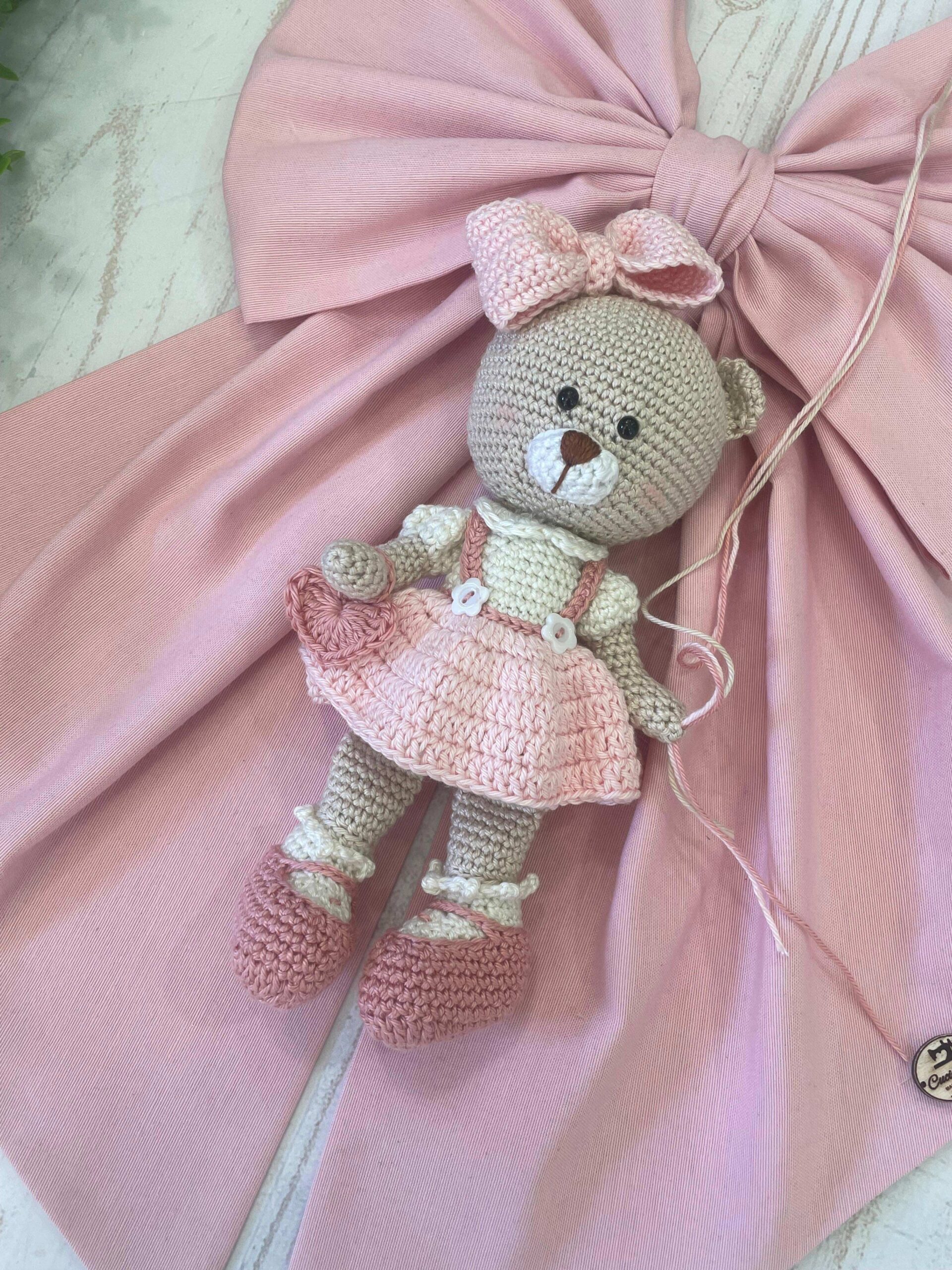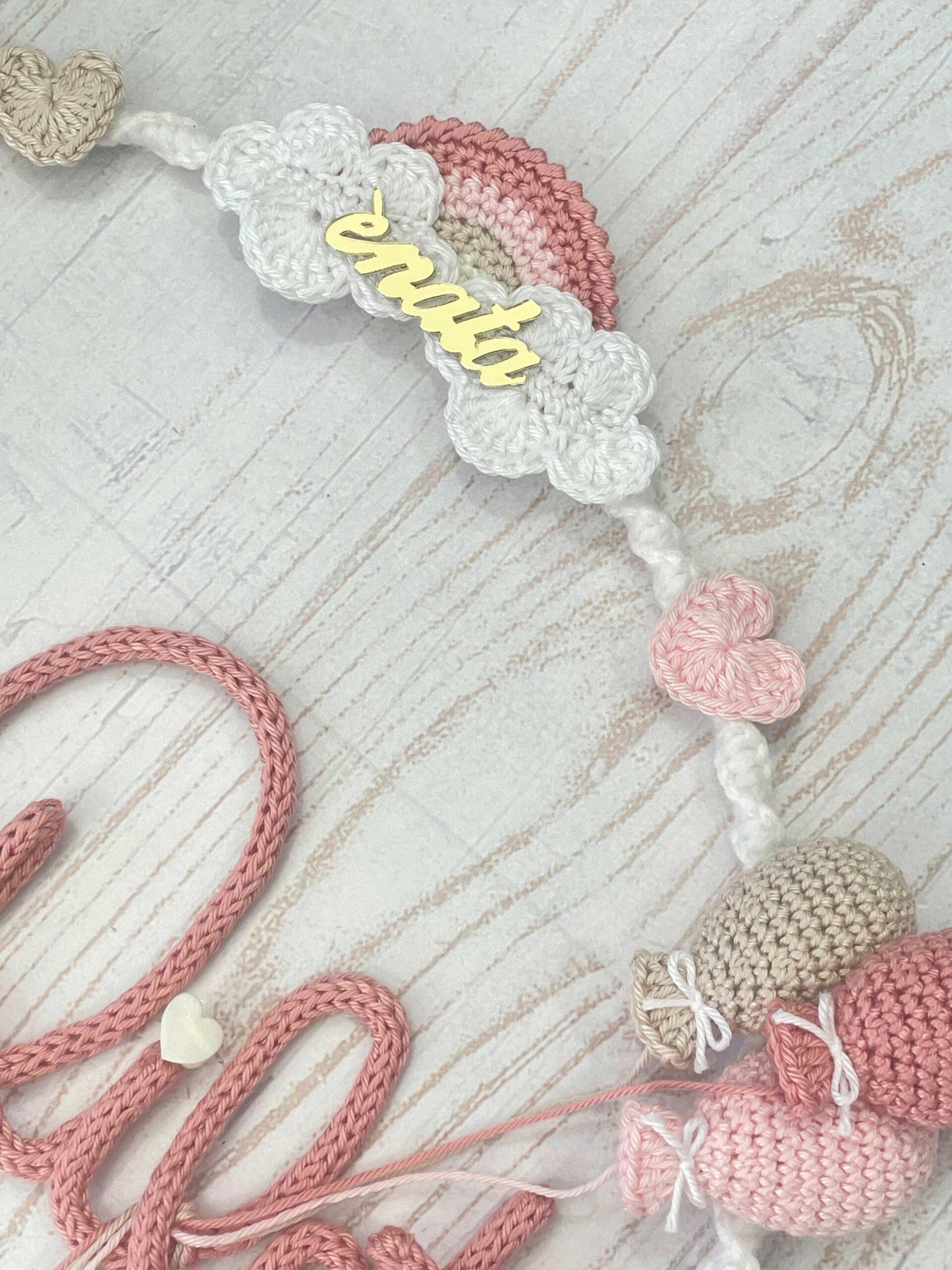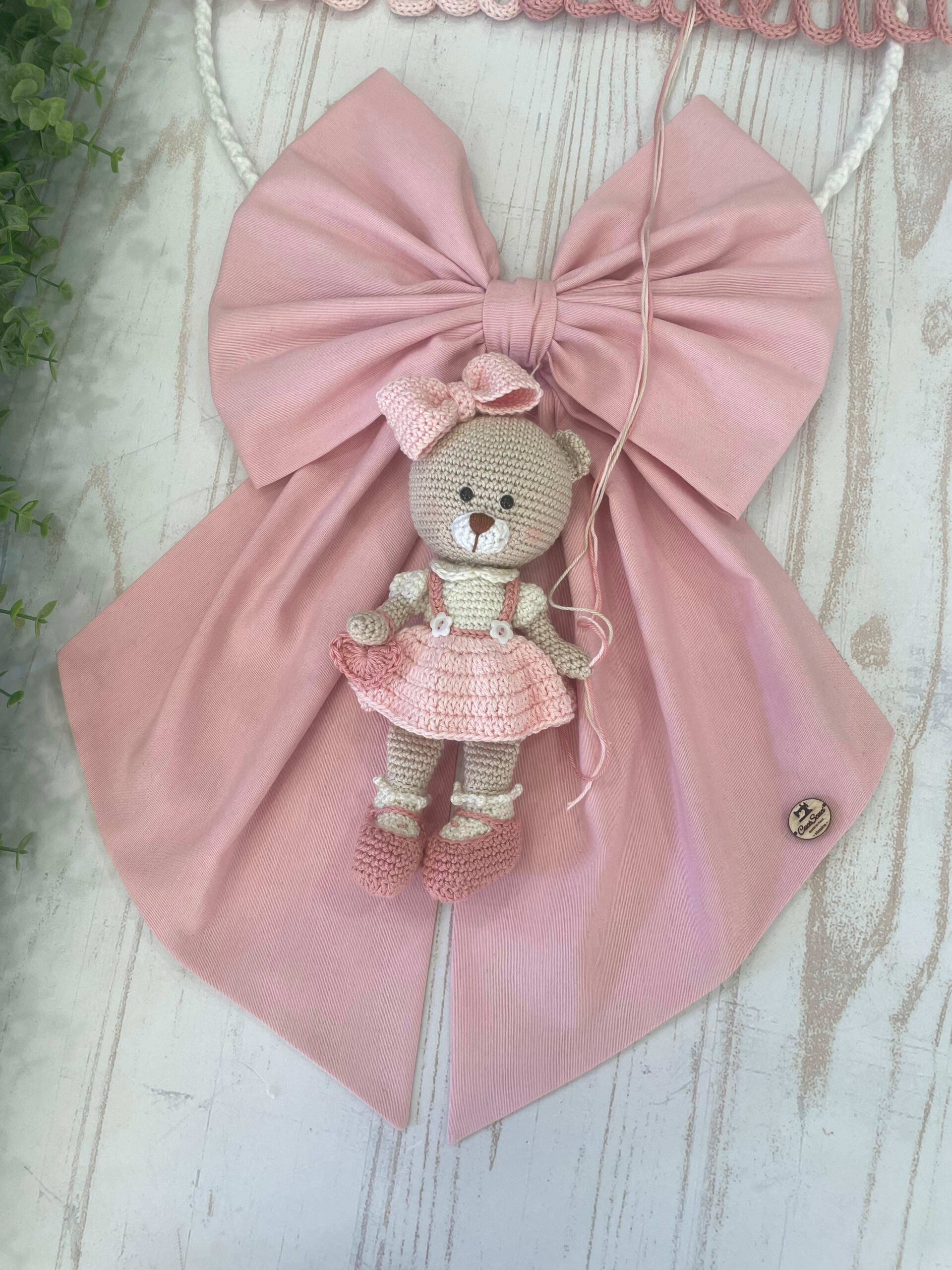 Al centro risaltano due nomi in tricotin nei toni del rosa, personalizzabili secondo le tue esigenze, mentre dal fiocco pende una dolcissima orsetta realizzata a mano con la tecnica amigurumi — simbolo di tenerezza e accoglienza.