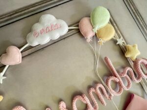Il fiocco, in cotone rosa, è impreziosito da un cerchio in metallo bianco decorato con palloncini e dettagli in pannolenci, che incornicia dolcemente il nome della bimba in tricotin rosa (personalizzabile).